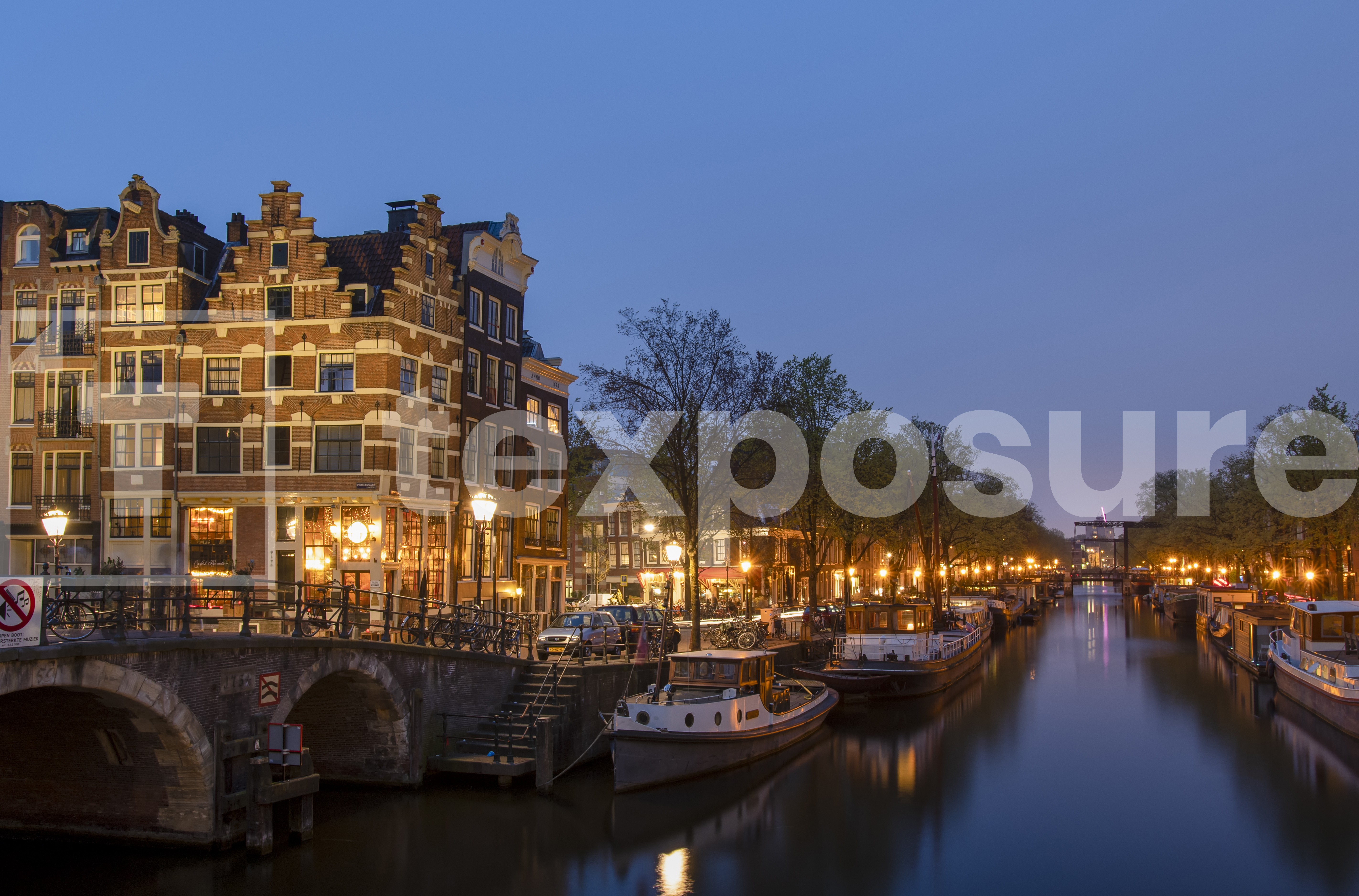 Op de hoek van de Prinsengracht en Brouwersgracht staat één van de meest fotogenieke grachtenpanden van Amsterdam. Het hoekhuis heeft twee trapgevels en is een absolute eyecatcher. Dit werk is gemaakt tijdens het blauwe uurtje. De straatlichtjes branden diffuus en het pand is prachtig verlicht. Voor het pand is de mooie stenen brug te zien. De tientallen woonboten in het rimpelloze water van de Brouwersgracht vervolmaken het beeld.