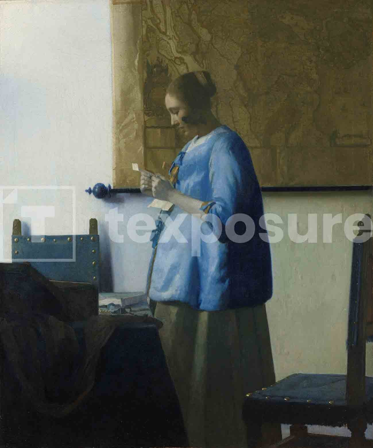 Schilderij van Johannes Vermeer met als titel brieflezende vrouw op textieldoek.