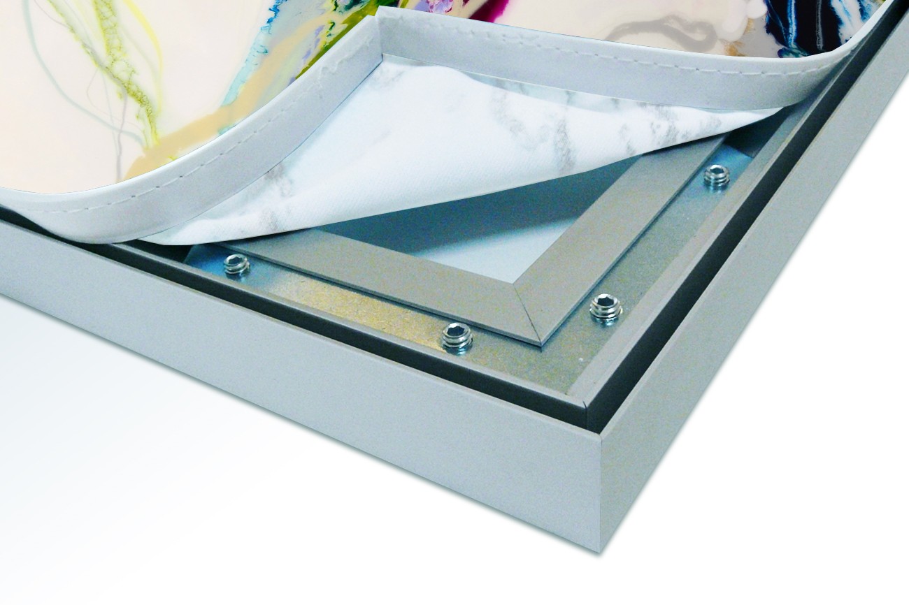 Het aluminium XL Wall Art frame is vanaf de zijde gezien 25 mm hoog, vanaf de voorzijde van de XL Wall Art zie je slechts een aluminium rand van circa 1 mm. De print wordt d.m.v. de sublimatie methode in en op het XL Wall Art doek (220 grams decostof) aangebracht en waarna het doek aan de achterzijde wordt voorzien van een rubber pees. Hierdoor is het werk gemakkelijk in het XL Wall Art frame te plaatsen.