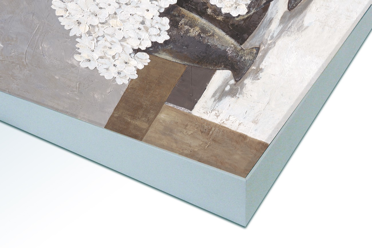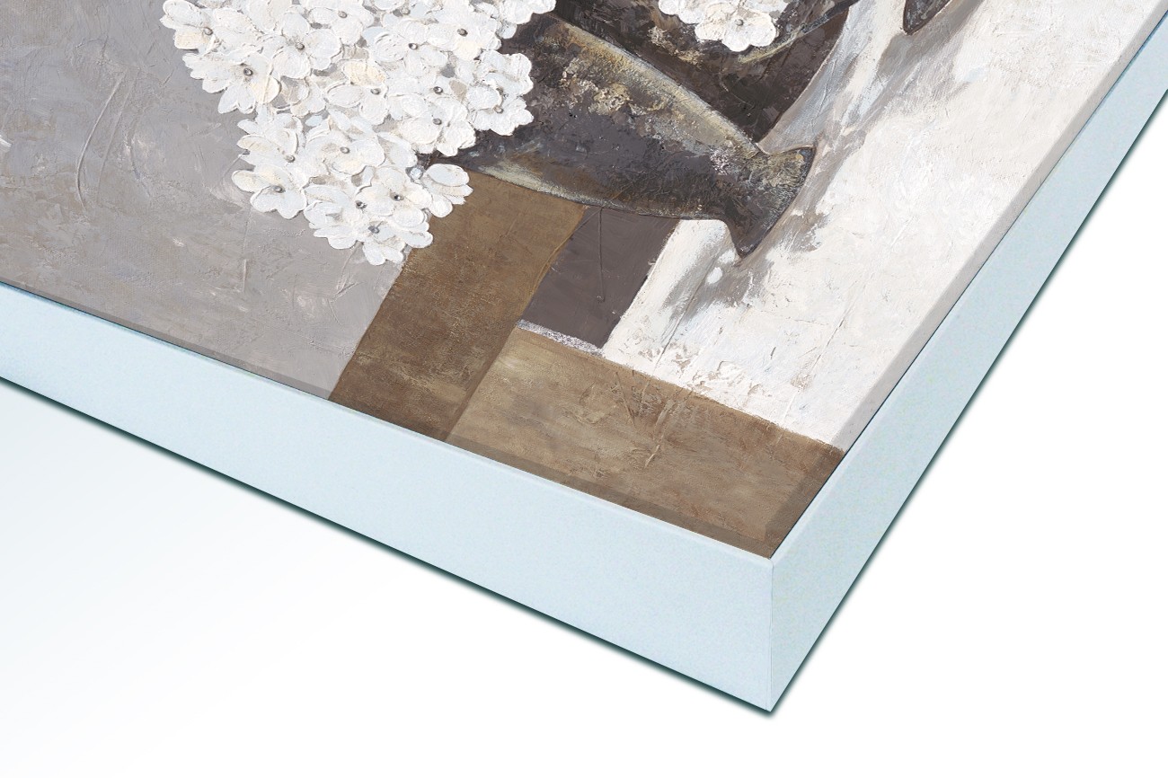 Dit stilleven van bloemenboeket in vaas is opgebouwd uit natuurtinten. De rustige tinten zorgen ervoor dat het werk in veel interieurs past.