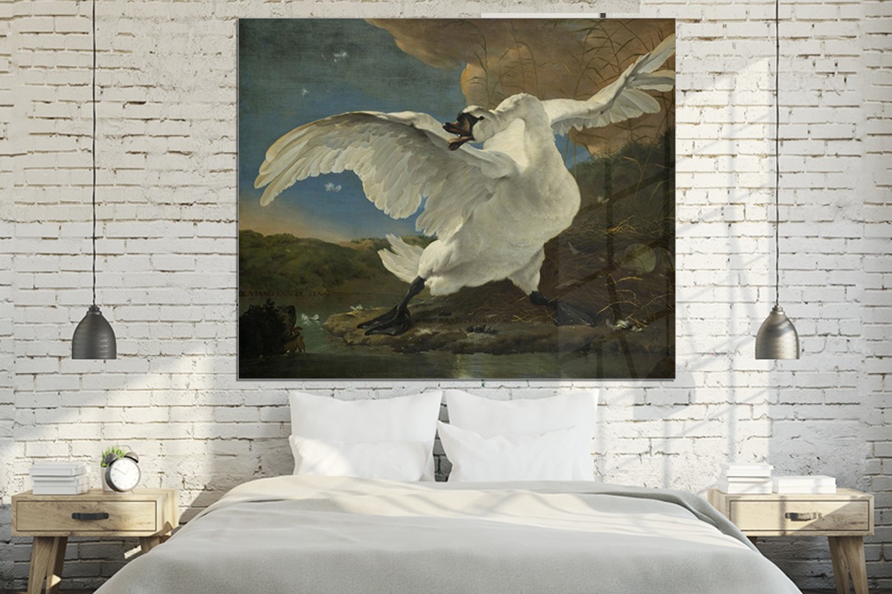 Grote zwaan op de voorgrond van Jan Asselijn met als titel De bedreigende zwaan.