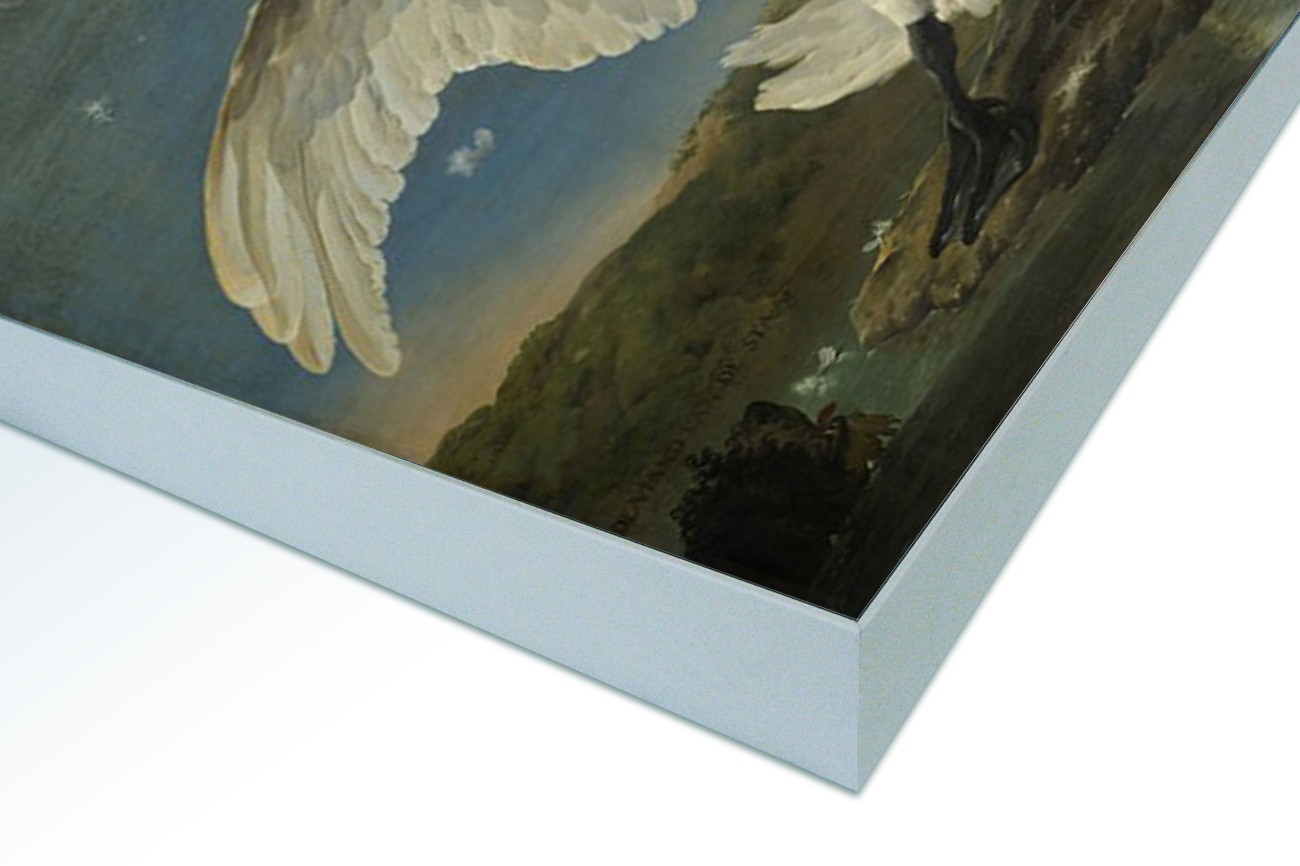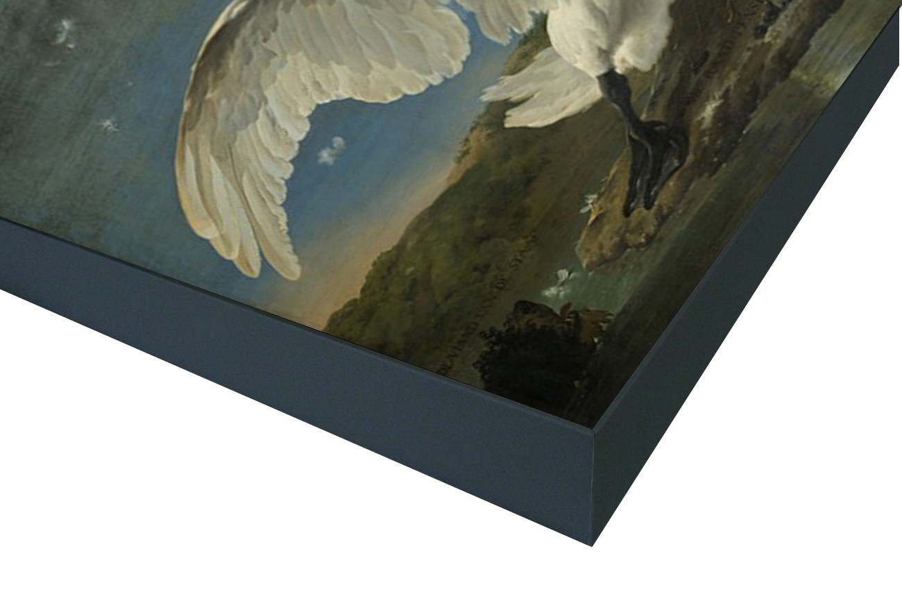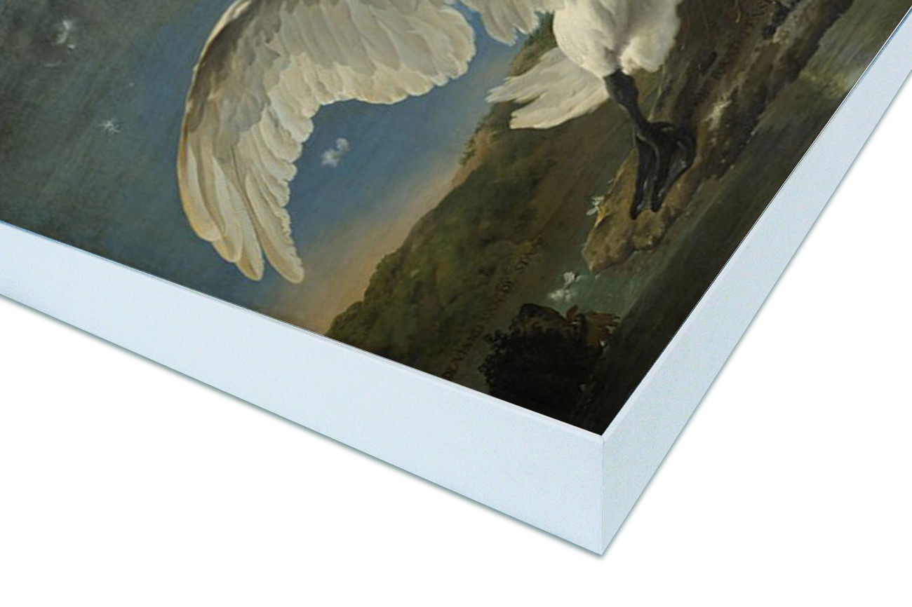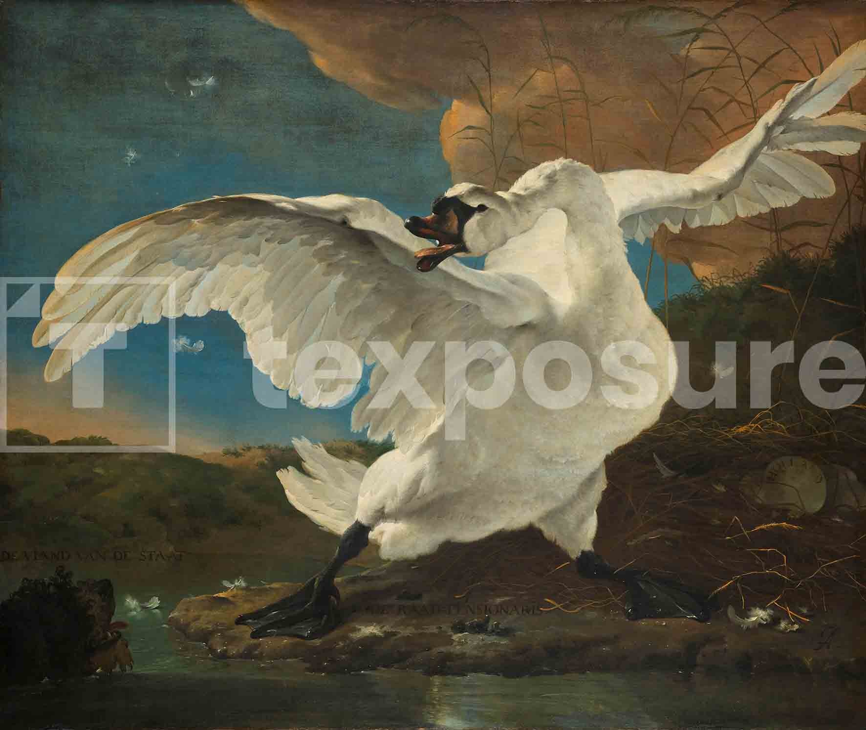 Energiek verdedigt een zwaan haar nest tegen een hond. Het gevecht werd in latere eeuwen politiek geduid: de witte zwaan werd opgevat als de in 1672 vermoorde staatsman Johan de Witt, die het land verdedigt tegen zijn vijanden. Dit werk van Frans Hals is beschikbaar in verschillende formaten, inclusief textiel frame.