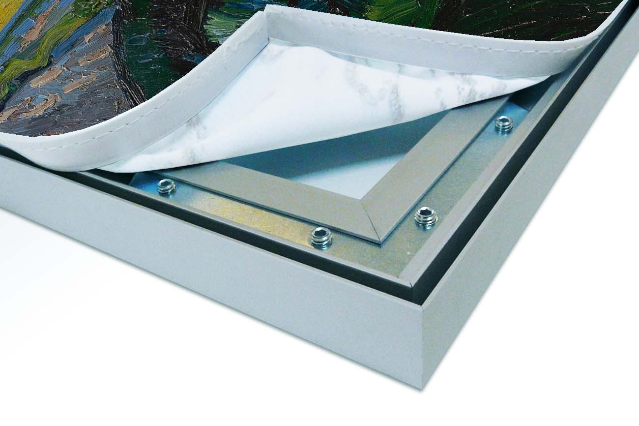 Het aluminium XL Wall Art frame is vanaf de zijde gezien 25 mm hoog, vanaf de voorzijde van de XL Wall Art zie je slechts een aluminium rand van circa 1 mm. De print wordt d.m.v. de sublimatie methode in en op het XL Wall Art doek (220 grams decostof) aangebracht en waarna het doek aan de achterzijde wordt voorzien van een rubber pees. Hierdoor is het werk gemakkelijk in het XL Wall Art frame te plaatsen.