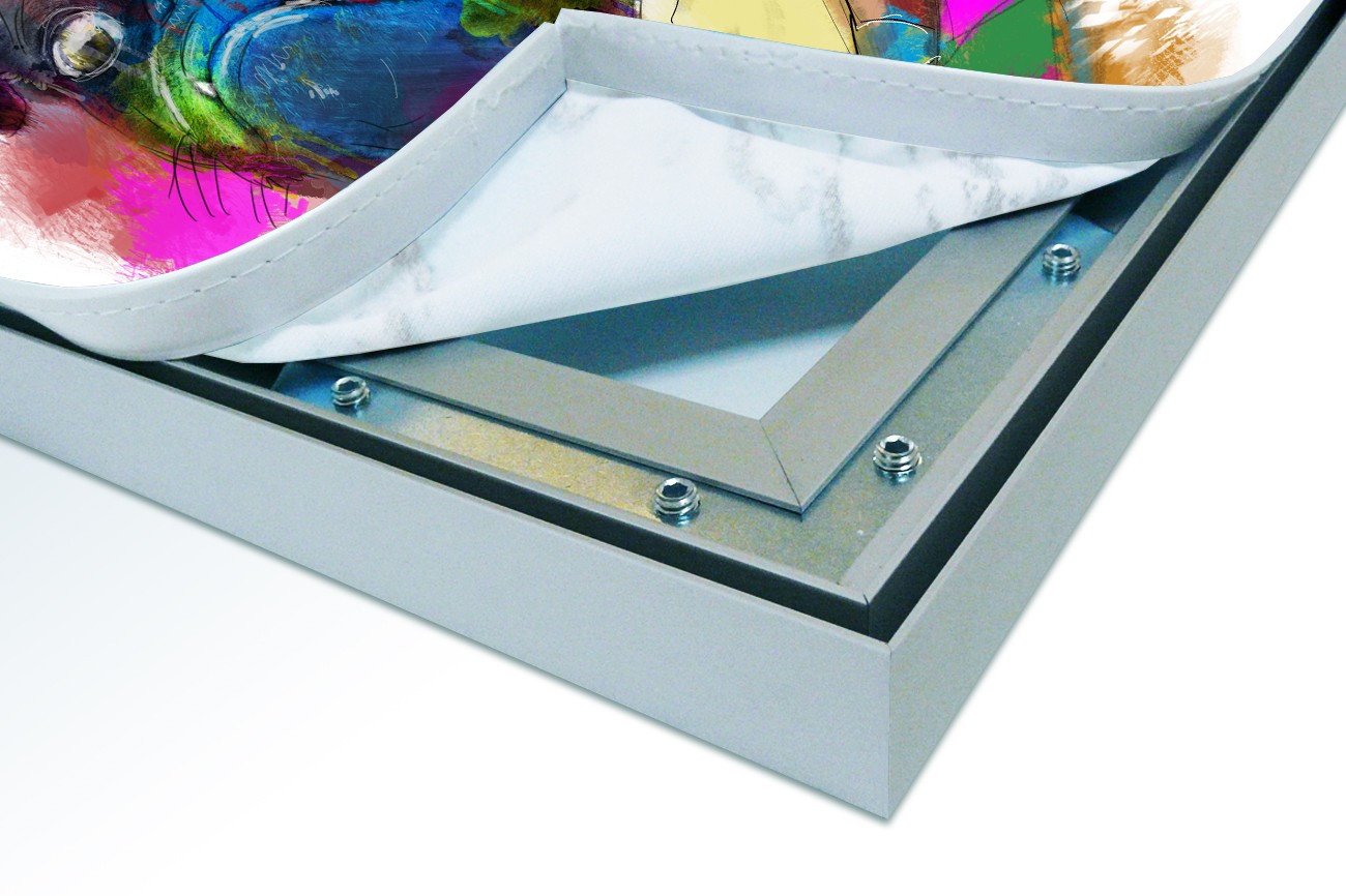 Het aluminium XL Wall Art frame is vanaf de zijde gezien 25 mm hoog, vanaf de voorzijde van de XL Wall Art zie je slechts een aluminium rand van circa 1 mm. De print wordt d.m.v. de sublimatie methode in en op het XL Wall Art doek (220 grams decostof) aangebracht en waarna het doek aan de achterzijde wordt voorzien van een rubber pees. Hierdoor is het werk gemakkelijk in het XL Wall Art frame te plaatsen.