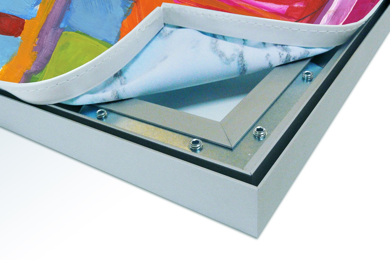 Het aluminium XL Wall Art frame is vanaf de zijde gezien 25 mm hoog, vanaf de voorzijde van de XL Wall Art zie je slechts een aluminium rand van circa 1 mm. De print wordt d.m.v. de sublimatie methode in en op het XL Wall Art doek (220 grams decostof) aangebracht en waarna het doek aan de achterzijde wordt voorzien van een rubber pees. Hierdoor is het werk gemakkelijk in het XL Wall Art frame te plaatsen.