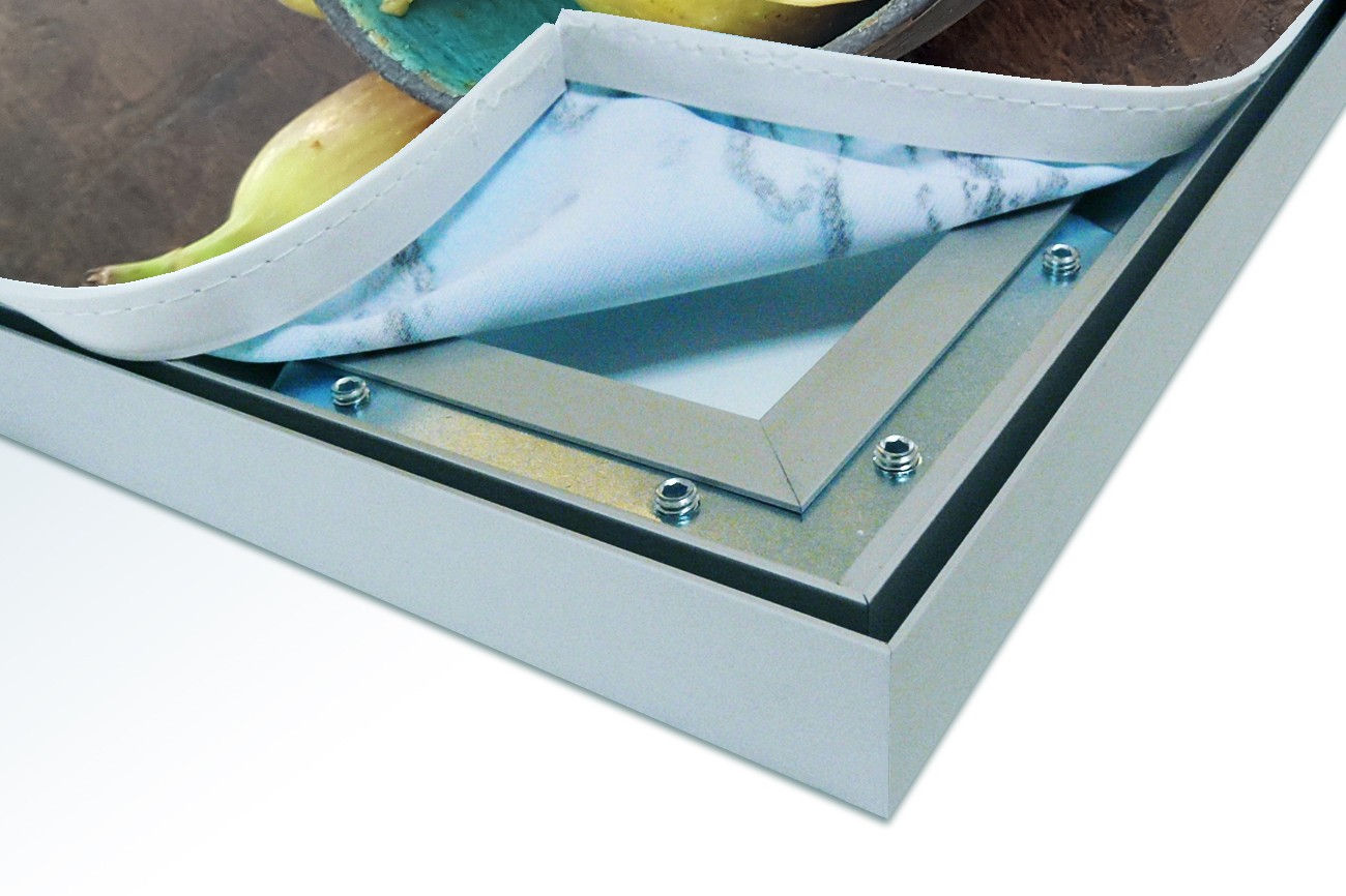 Het aluminium XL Wall Art frame is vanaf de zijde gezien 25 mm hoog, vanaf de voorzijde van de XL Wall Art zie je slechts een aluminium rand van circa 1 mm. De print wordt d.m.v. de sublimatie methode in en op het XL Wall Art doek (220 grams decostof) aangebracht en waarna het doek aan de achterzijde wordt voorzien van een rubber pees. Hierdoor is het werk gemakkelijk in het XL Wall Art frame te plaatsen.