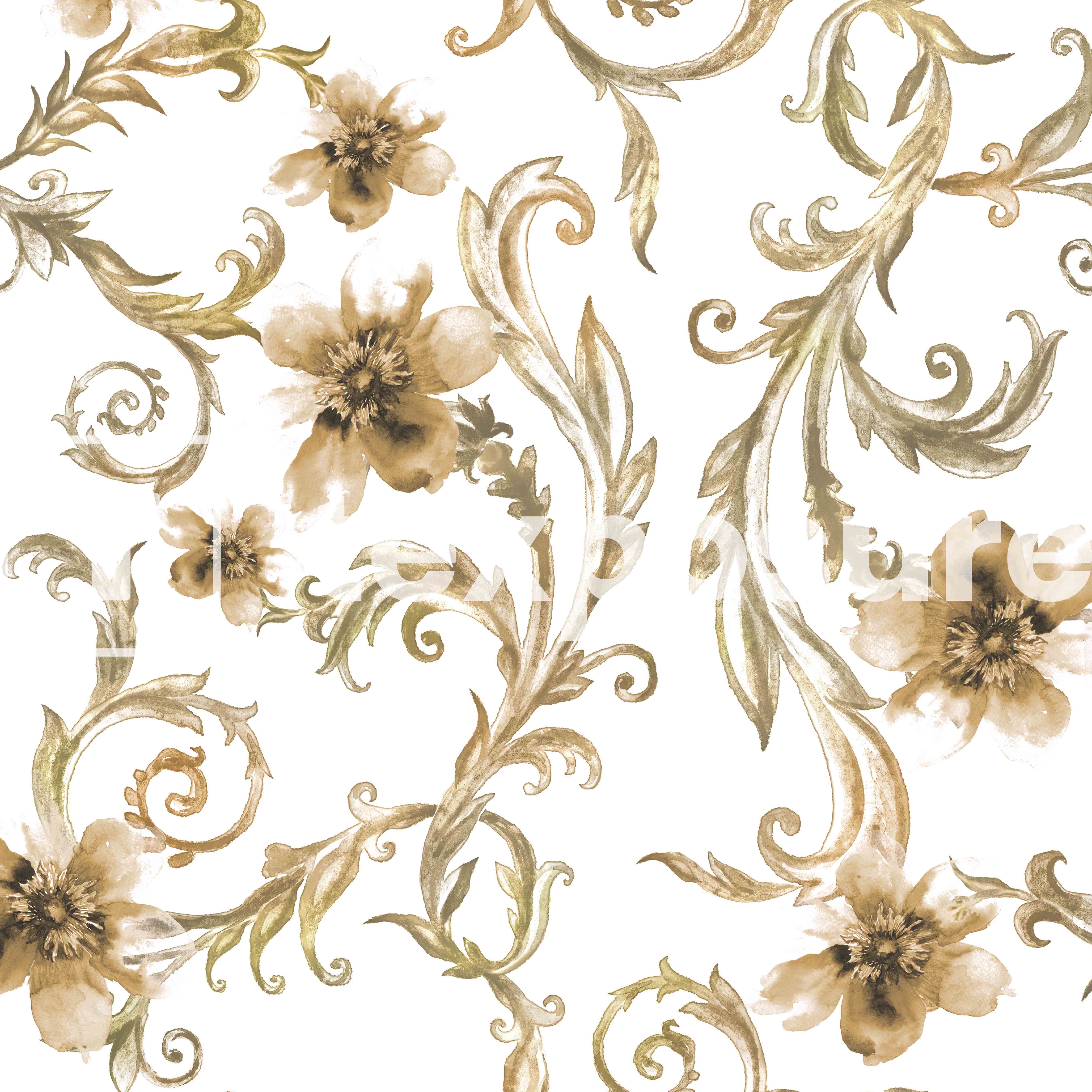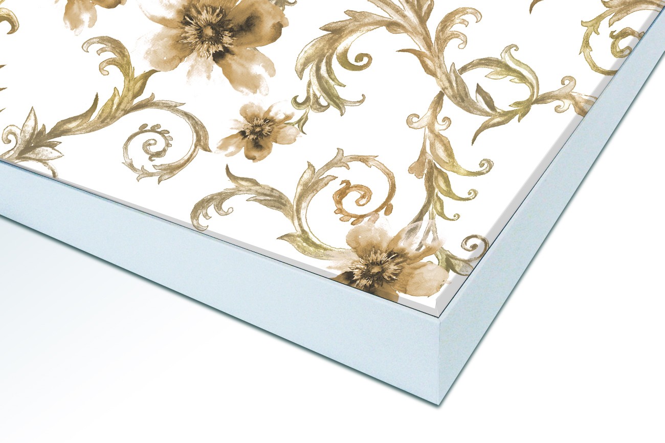 Licht schilderij dat gouden bloemen weergeeft in barok stijl. De chique uitstraling van het werk past bij de stijl van Victoria Brown. Flair II is verkrijgbaar in verschillende formaten, inclusief textiel frame.