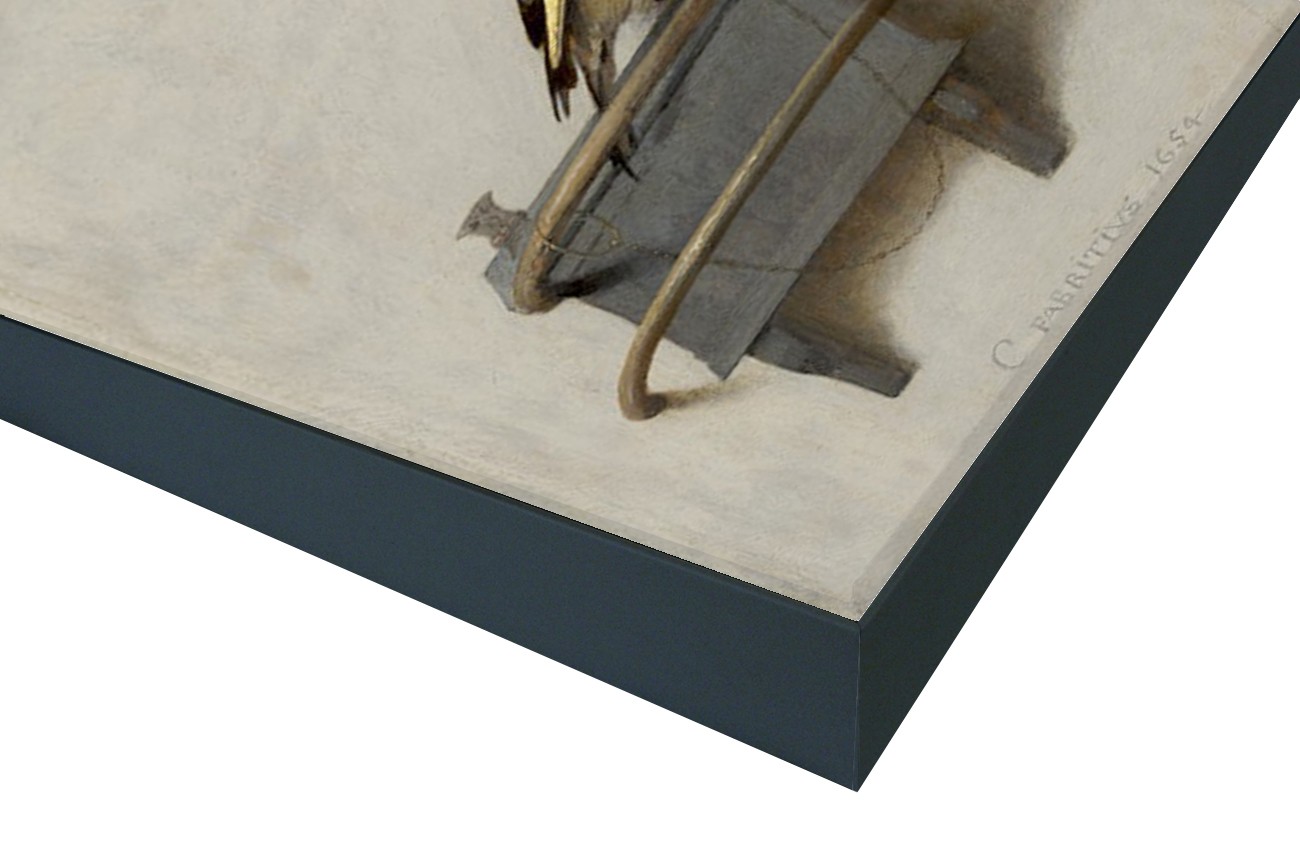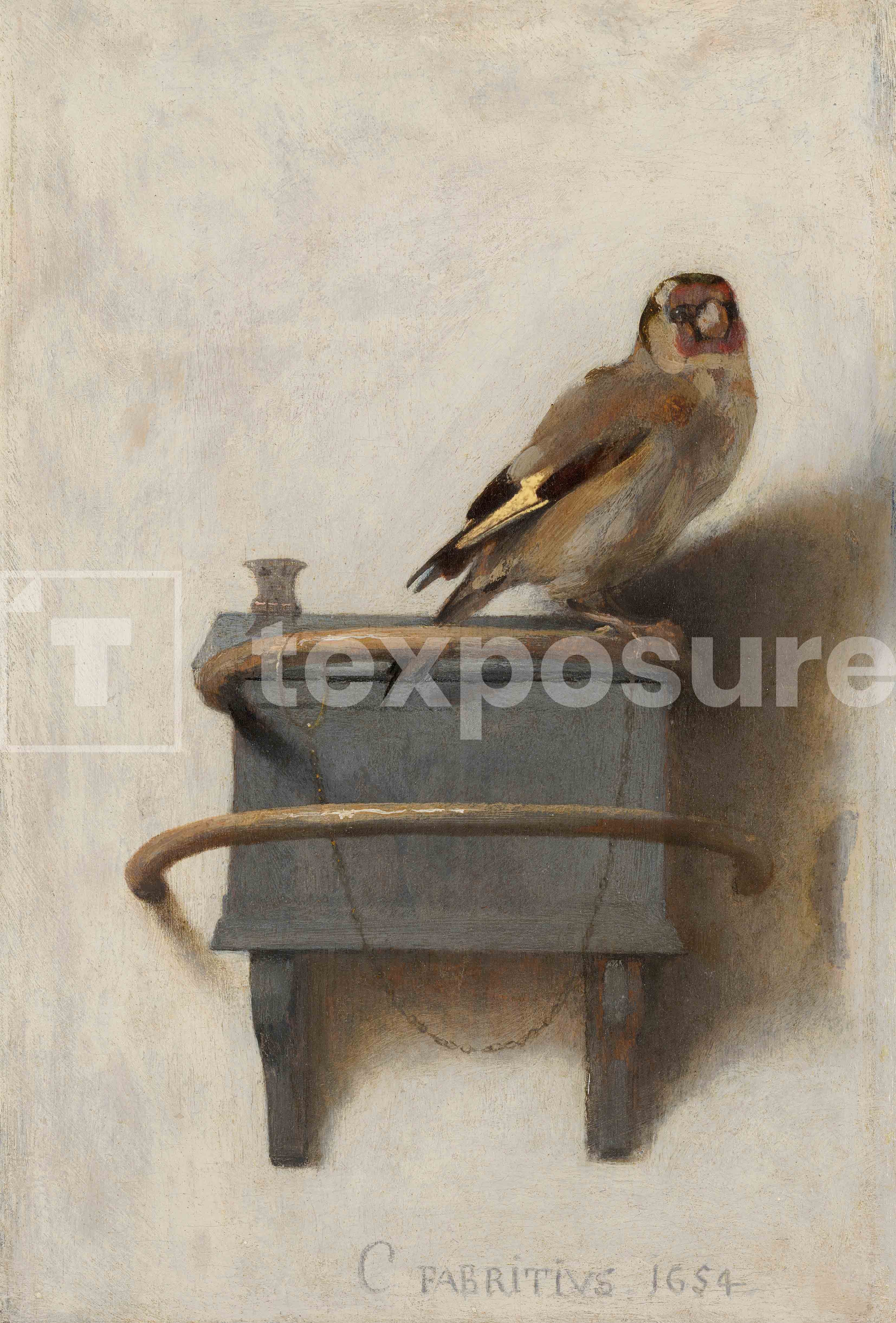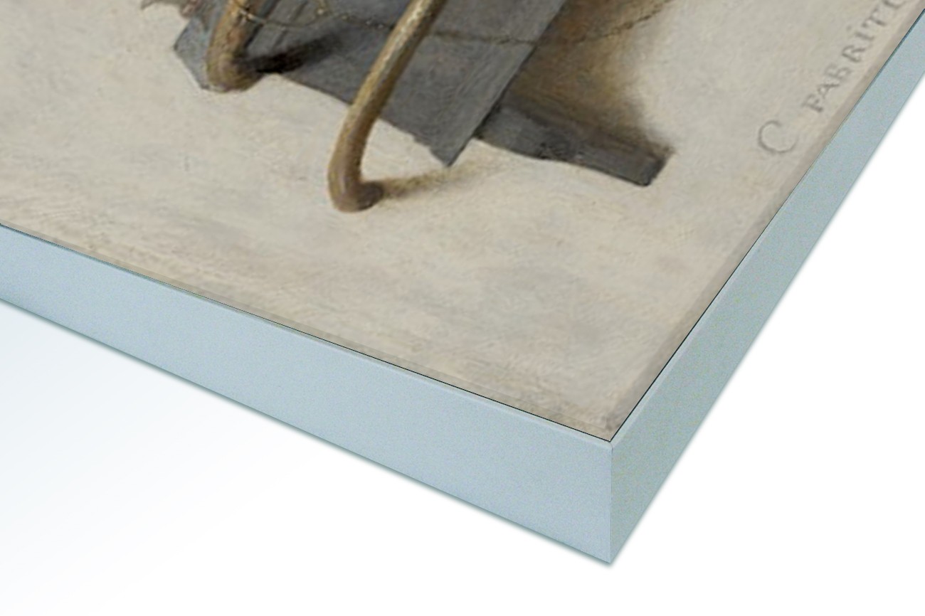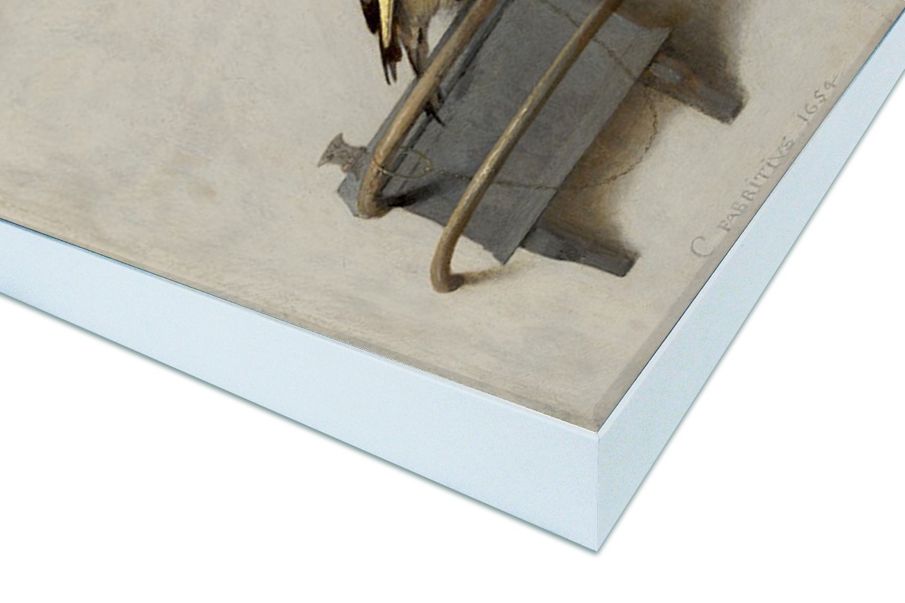 Een distelvink ook wel het puttertje genoemd. Hij zit op zijn voerbak. Putters waren populaire huisdieren, omdat ze trucjes konden leren zoals water halen uit een schaal met een miniatuur emmer. Dit werk van Fabritius is verkrijgbaar in verschillende formaten, inclusief textiel frame.