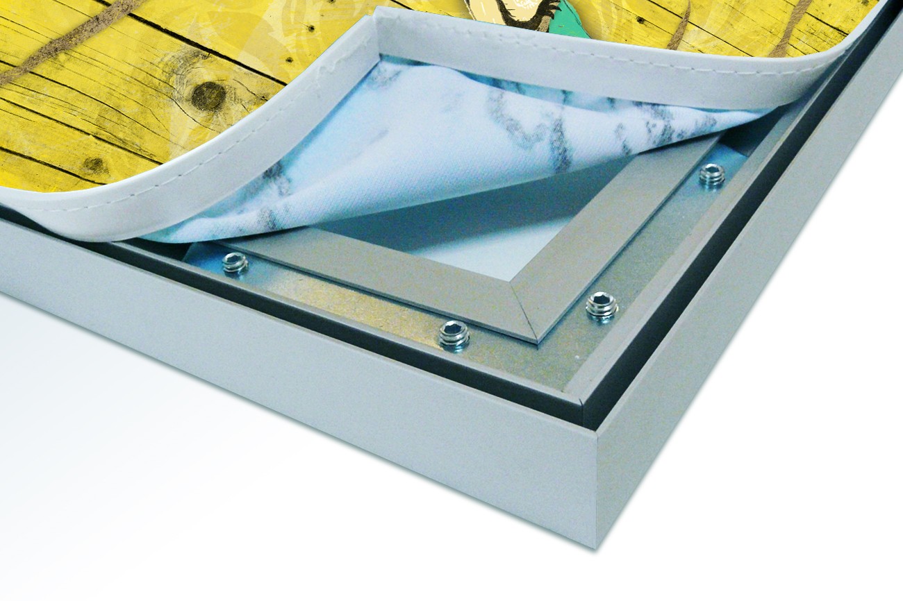 Het aluminium XL Wall Art frame is vanaf de zijde gezien 25 mm hoog, vanaf de voorzijde van de XL Wall Art zie je slechts een aluminium rand van circa 1 mm. De print wordt d.m.v. de sublimatie methode in en op het XL Wall Art doek (220 grams decostof) aangebracht en waarna het doek aan de achterzijde wordt voorzien van een rubber pees. Hierdoor is het werk gemakkelijk in het XL Wall Art frame te plaatsen.