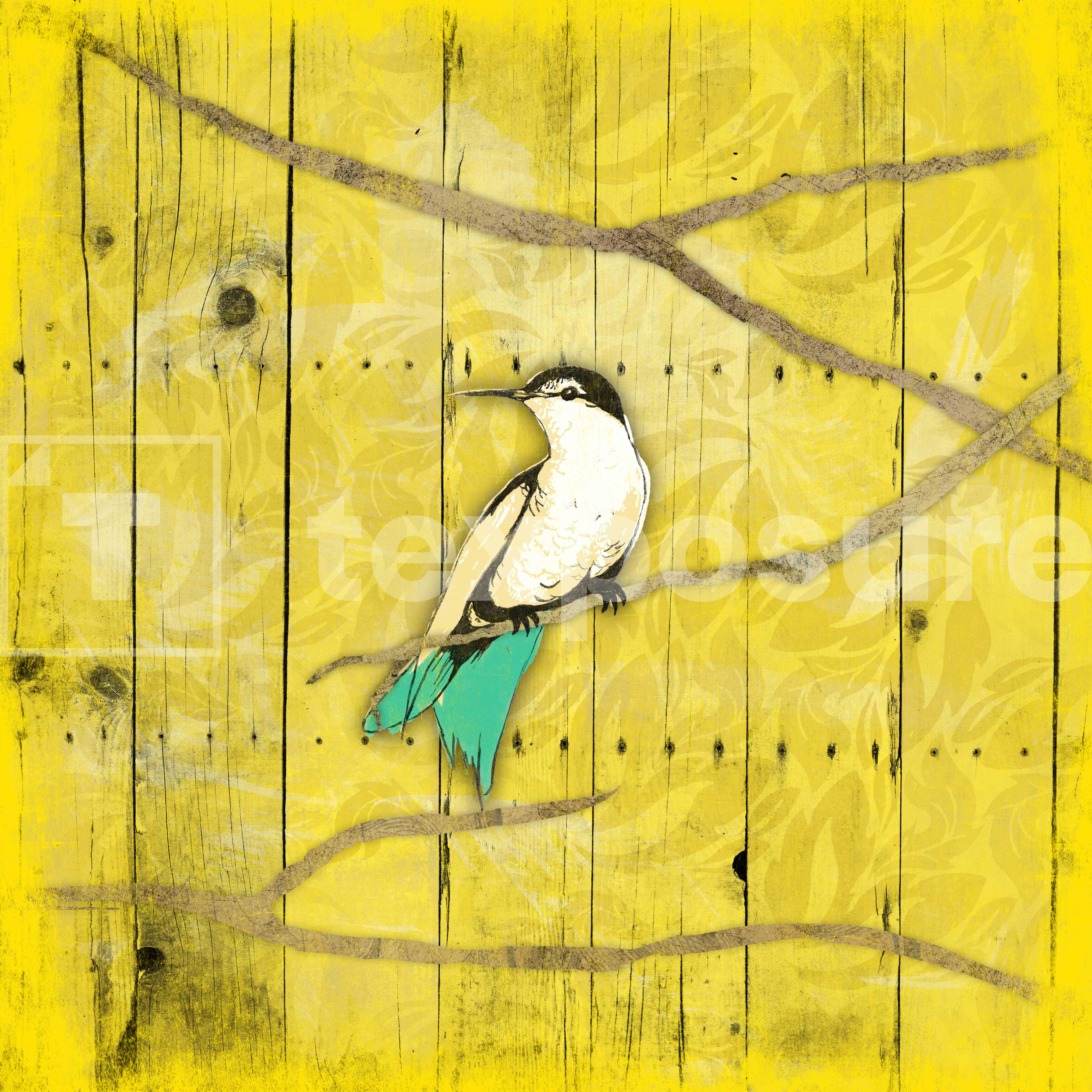 Door de frisse kleur geel is dit werk een echte eye catcher. Jace Grey laat de vogel de hoofdrol spelen in een paradijselijke omgeving.