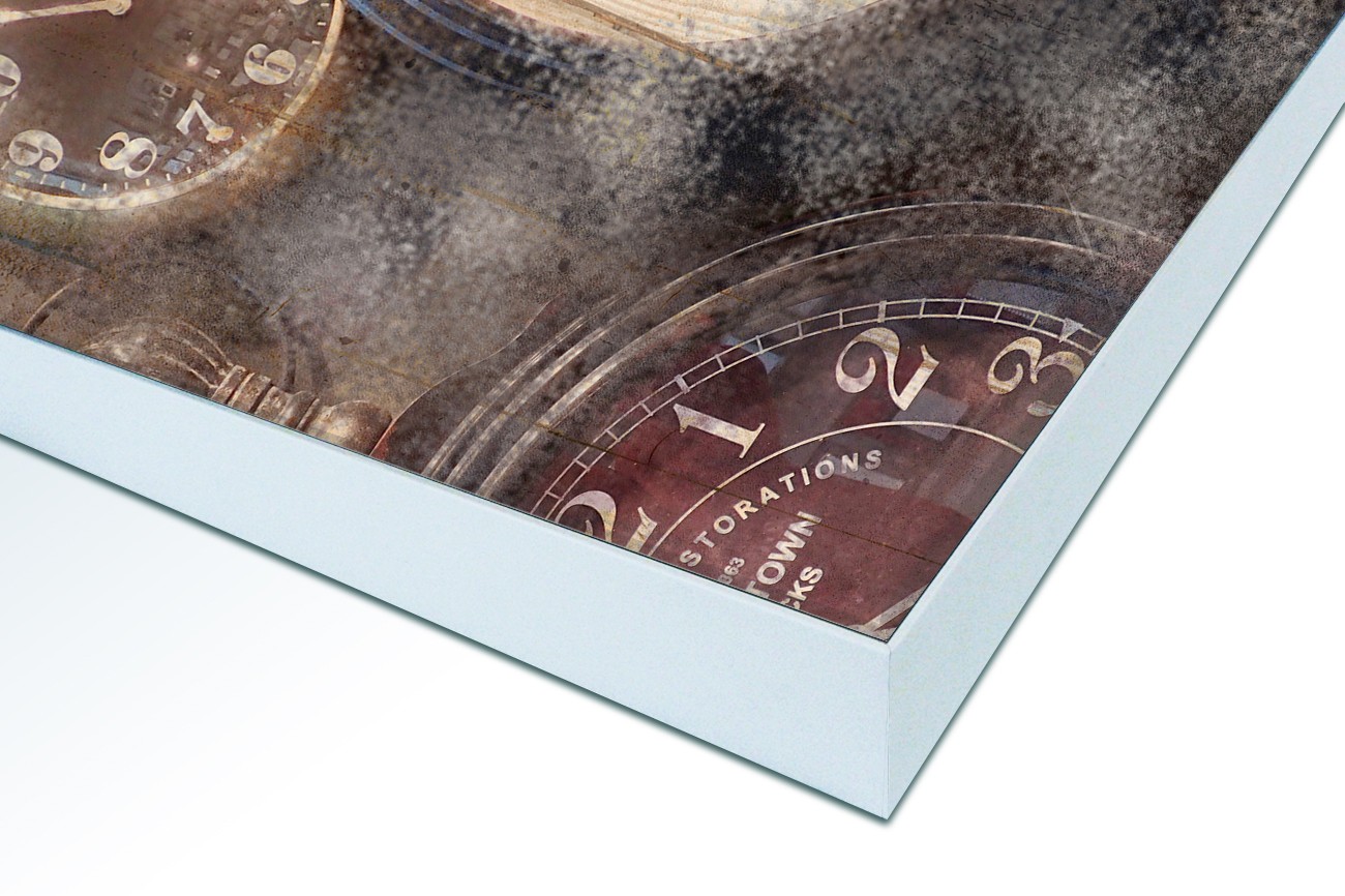 Dit werk is onderdeel van een serie met het onderwerp tijd. Kimberly Allen laat in dit werk verschillende klokken in aarde tinten zien. De ronde vormen met de scherpe lijnen van de wijzers vormen samen een interessante compositie. Verkrijgbaar in verschillende formaten, inclusief textiel frame.