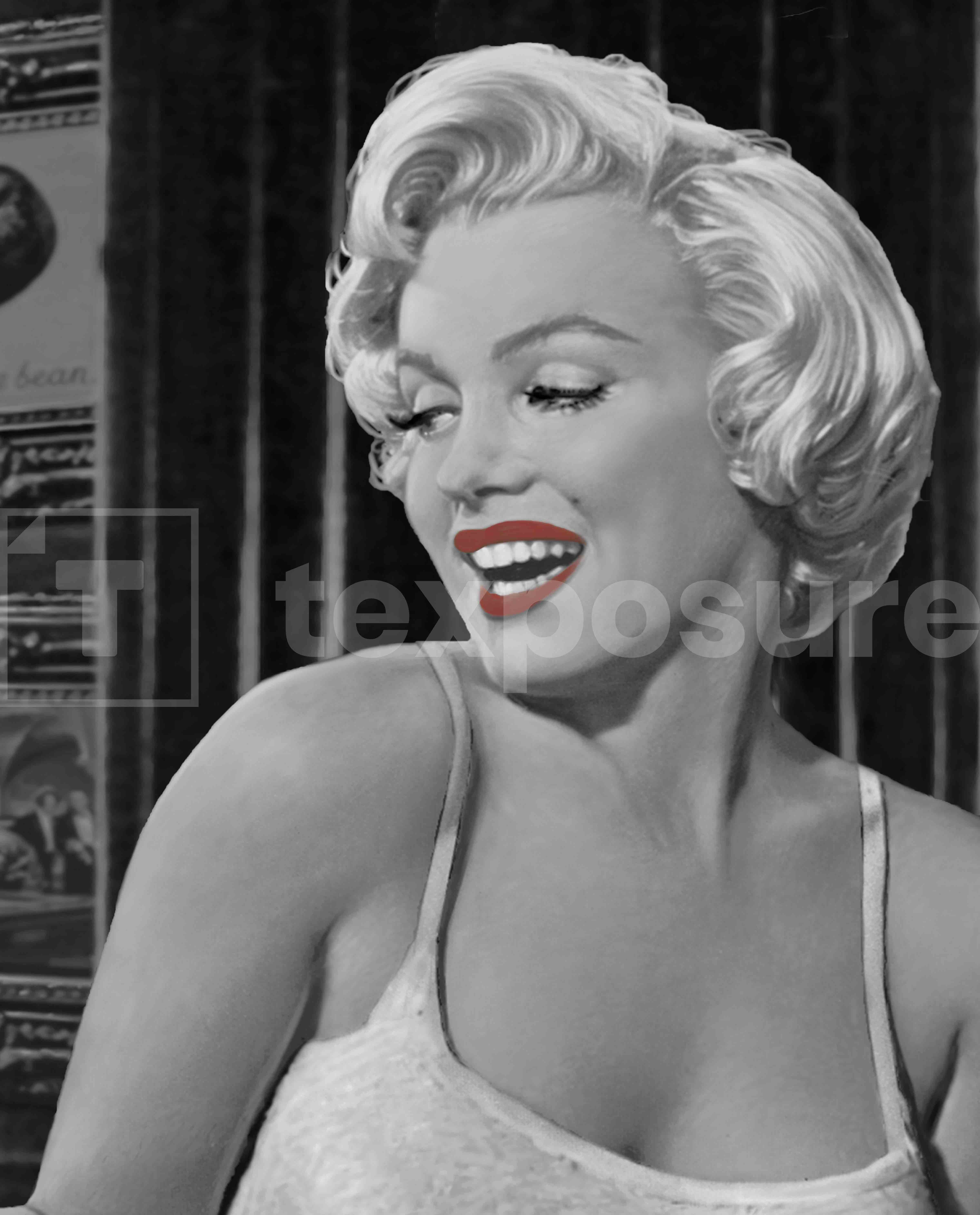 Iconisch beeld van een lachende Marylin Monroe. Zwart wit beeld met als eye-catcher haar mooie rode lippen. Verkrijgbaar in verschillende formaten op textieldoek, inclusief textielframe.