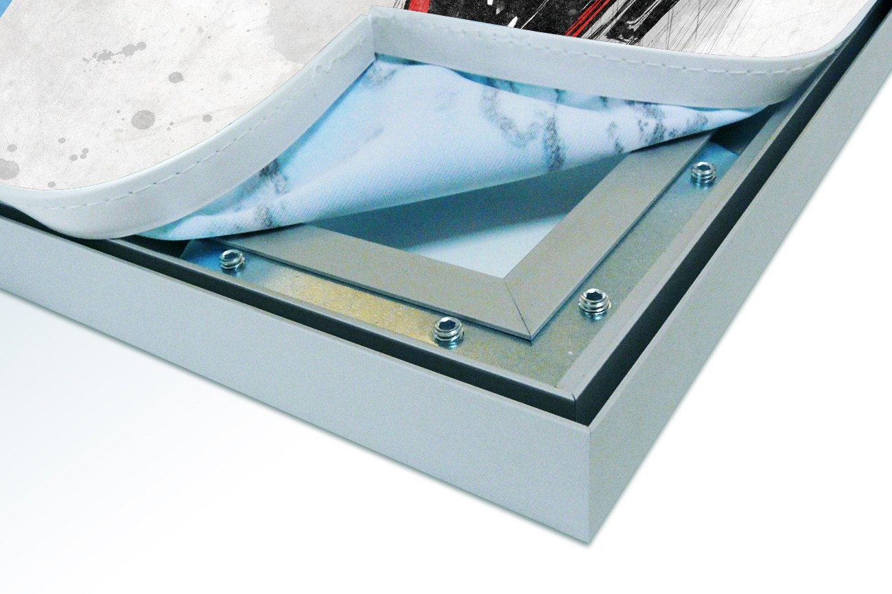 Het aluminium XL Wall Art frame is vanaf de zijde gezien 25 mm hoog, vanaf de voorzijde van de XL Wall Art zie je slechts een aluminium rand van circa 1 mm. De print wordt d.m.v. de sublimatie methode in en op het XL Wall Art doek (220 grams decostof) aangebracht en waarna het doek aan de achterzijde wordt voorzien van een rubber pees. Hierdoor is het werk gemakkelijk in het XL Wall Art frame te plaatsen.