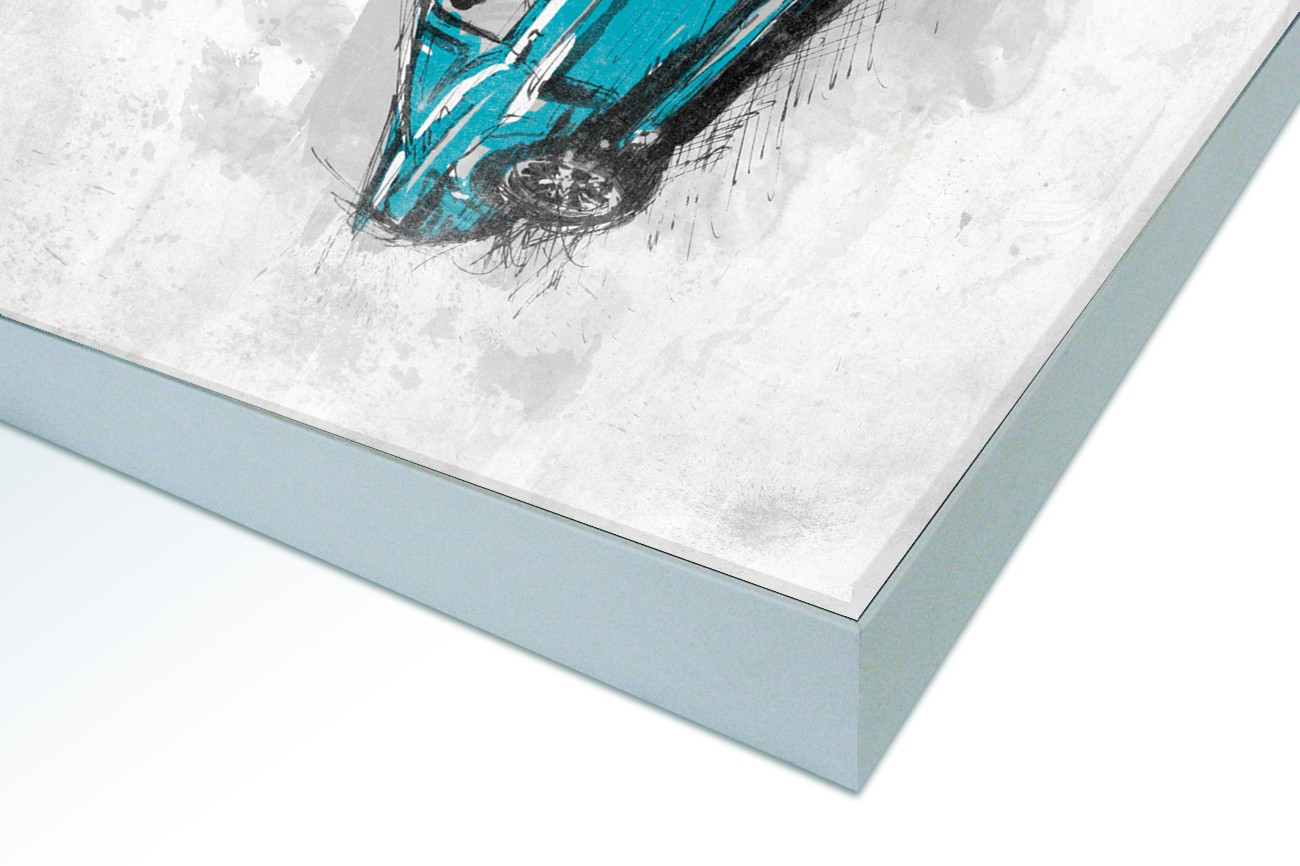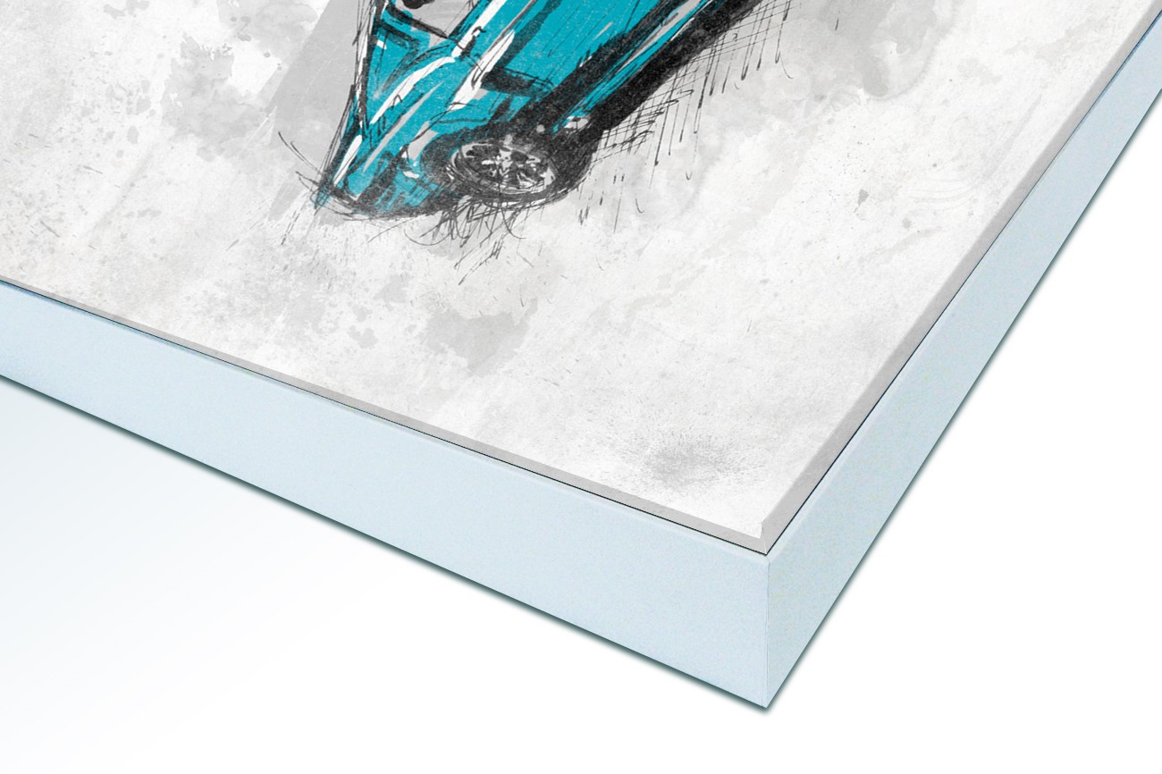 Schilderij met blauwe oude auto van Onrei met als titel Muscle car II op textieldoek.