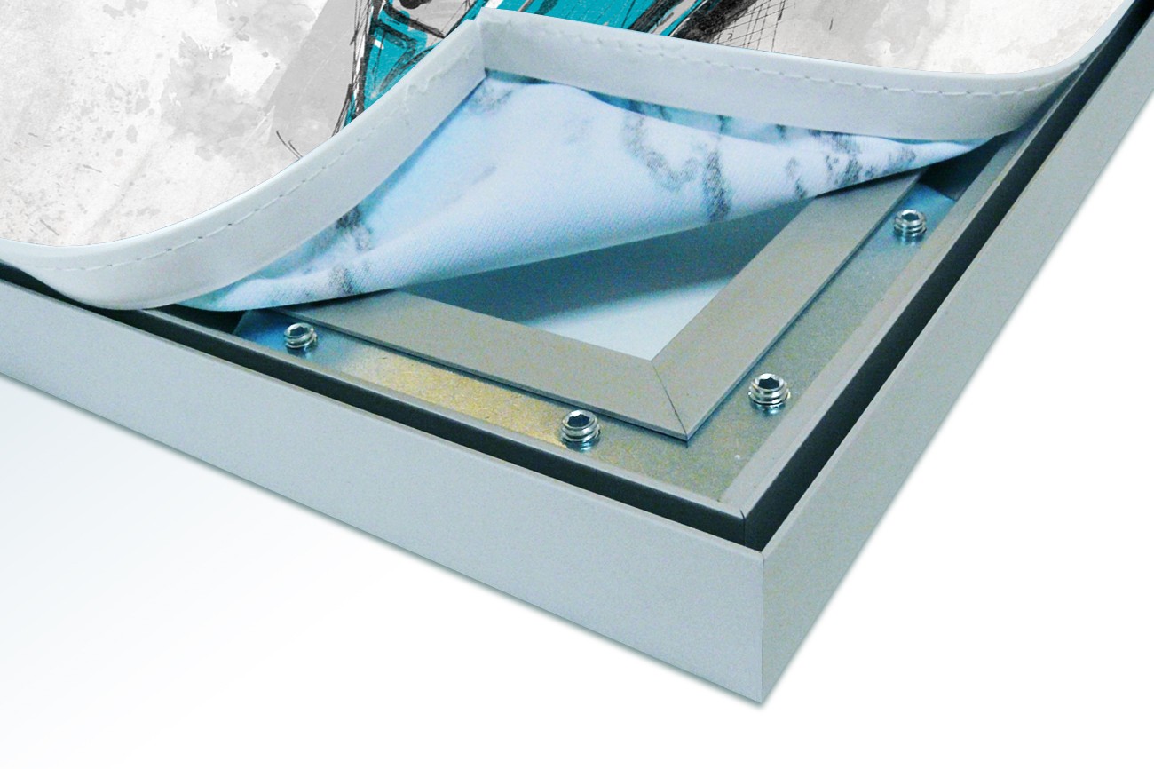 Het aluminium XL Wall Art frame is vanaf de zijde gezien 25 mm hoog, vanaf de voorzijde van de XL Wall Art zie je slechts een aluminium rand van circa 1 mm. De print wordt d.m.v. de sublimatie methode in en op het XL Wall Art doek (220 grams decostof) aangebracht en waarna het doek aan de achterzijde wordt voorzien van een rubber pees. Hierdoor is het werk gemakkelijk in het XL Wall Art frame te plaatsen.