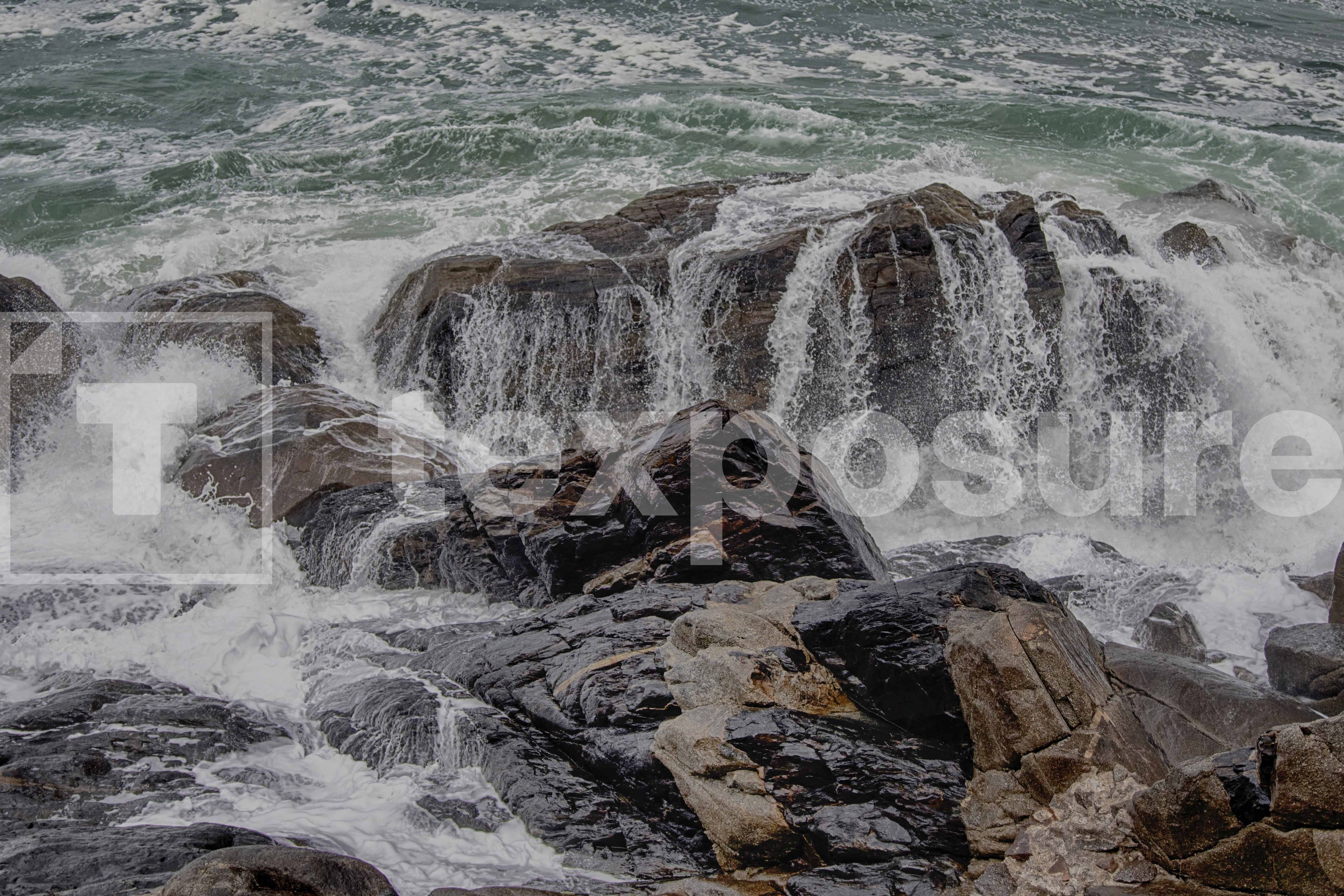 Metershoge golven aan de rotsachtige kust van Normandiƫ veroorzaken een spectaculaire branding. Het opspattend levert samen met de natte rotsen een fraai beeld op.
