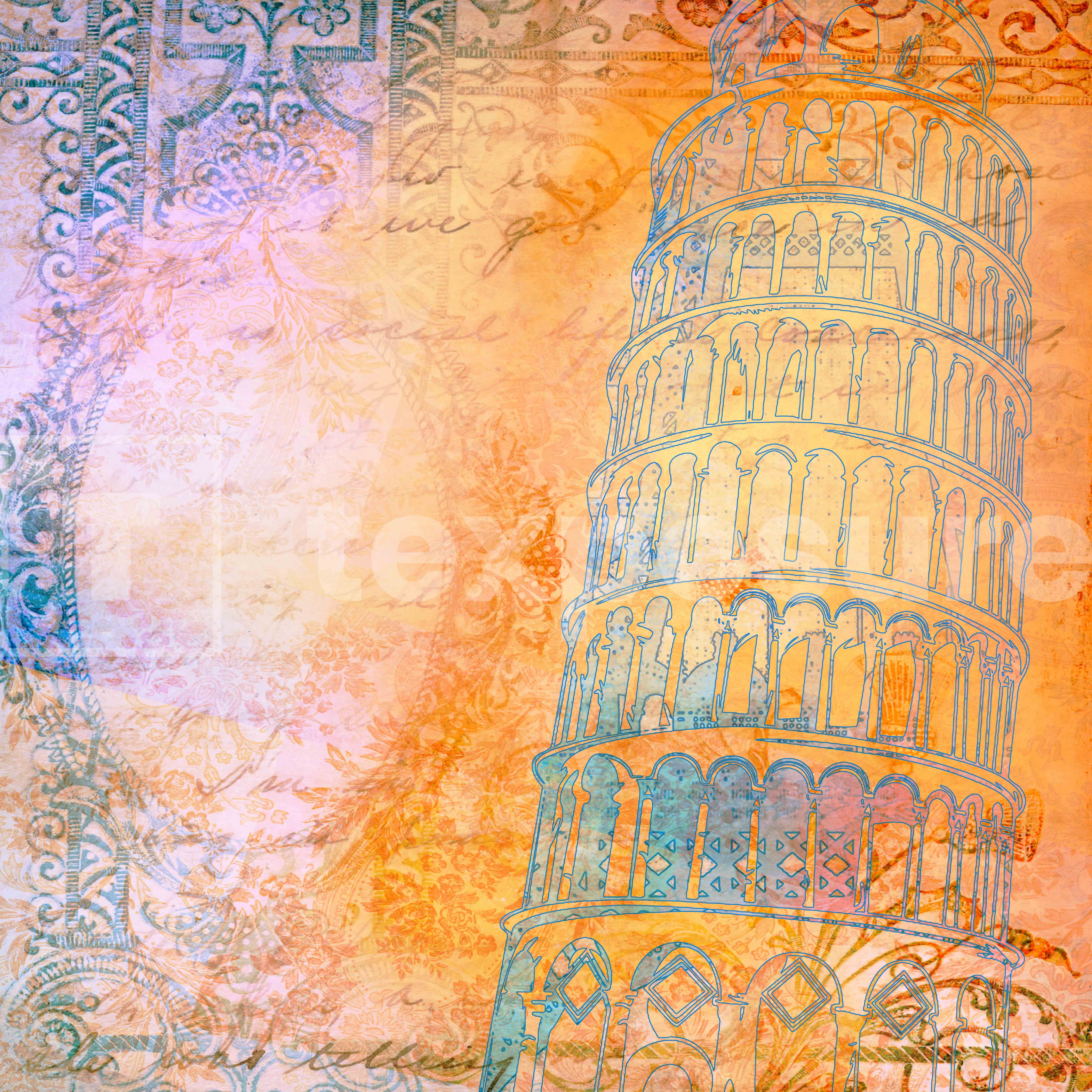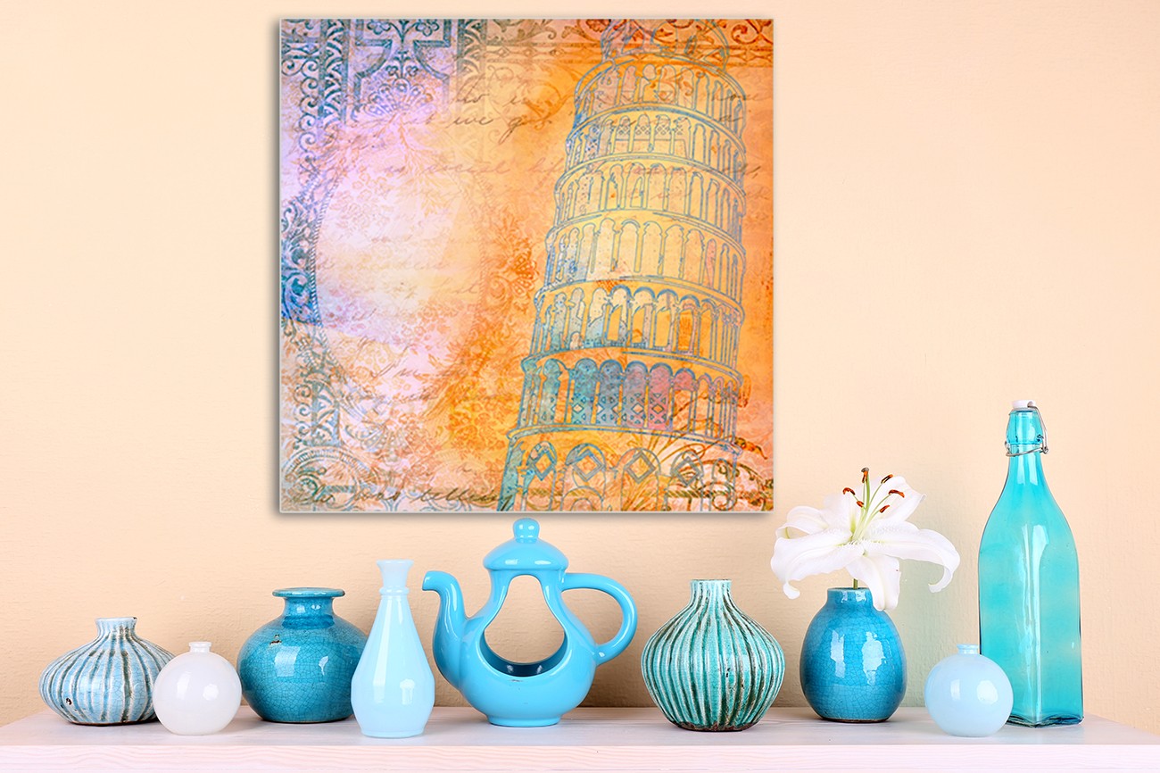 Cynthia Alvarez schildert in dit werk de toren van Pisa ( Italië ) in romantische kleuren. Door de scheve toren centraal te zetten bevat het werk spannende lijnen en weet zij de bijzondere architectuur van de toren prachtig weer te geven.
