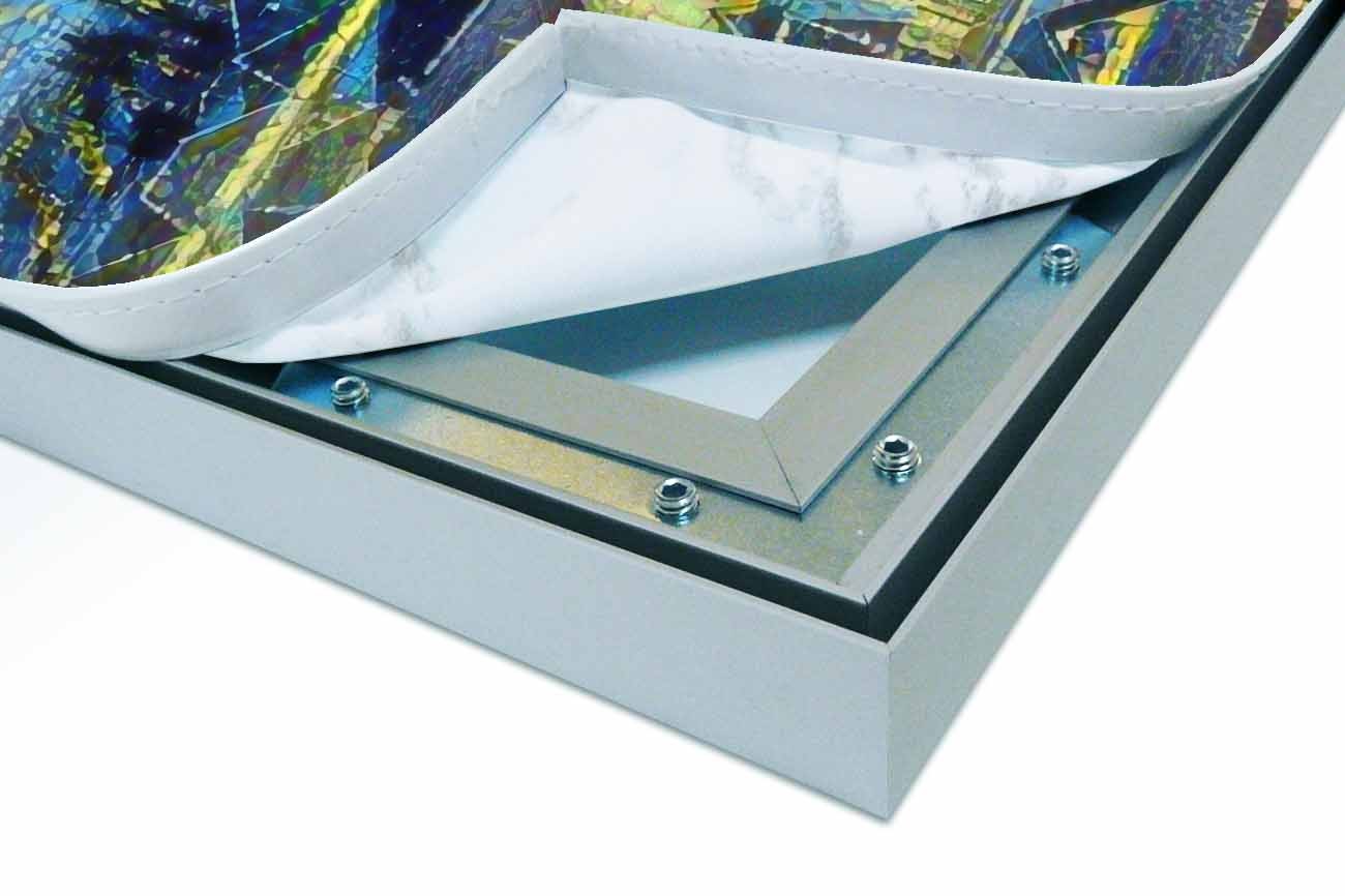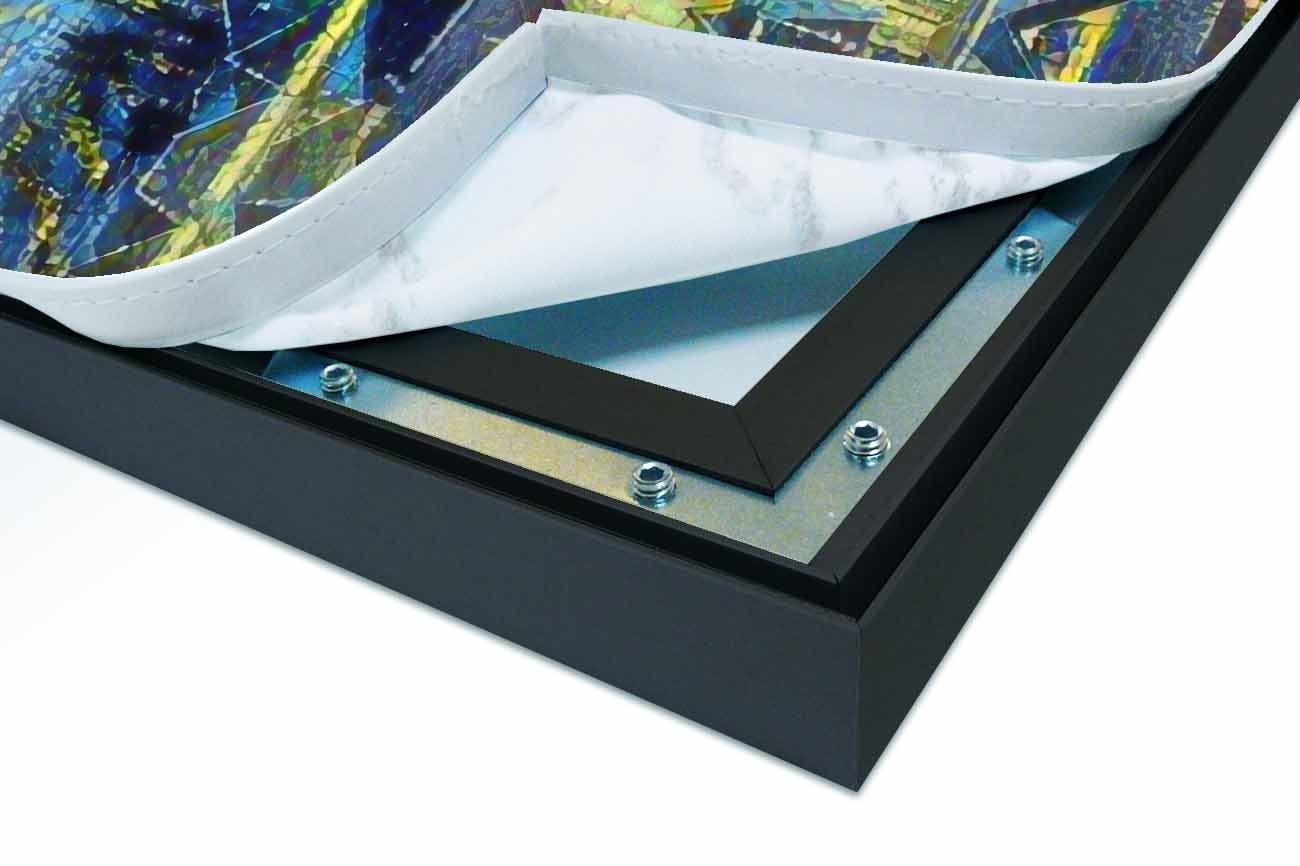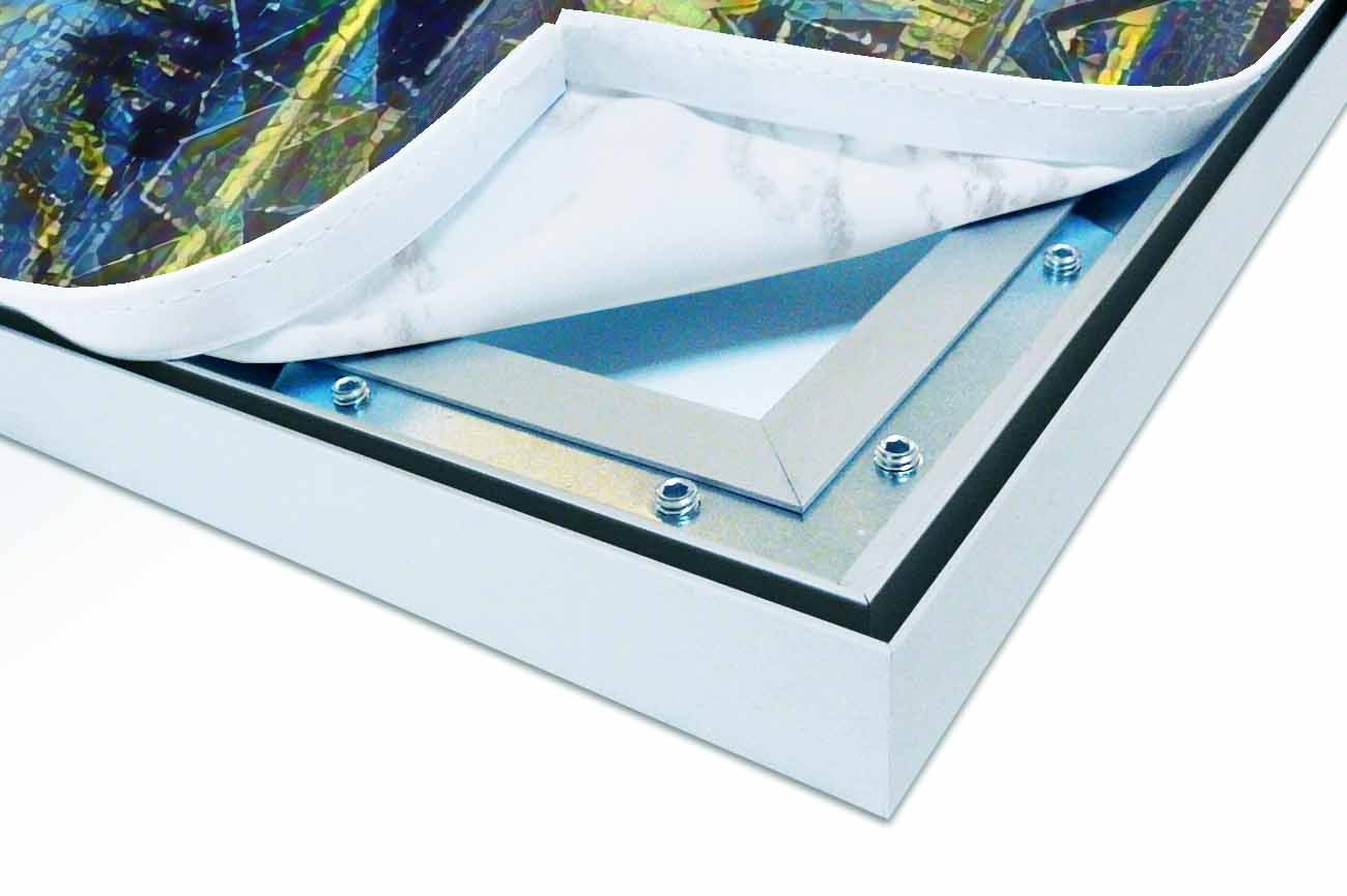 Het aluminium XL Wall Art frame is vanaf de zijde gezien 25 mm hoog, vanaf de voorzijde van de XL Wall Art zie je slechts een aluminium rand van circa 1 mm. De print wordt d.m.v. de sublimatie methode in en op het XL Wall Art doek (220 grams decostof) aangebracht en waarna het doek aan de achterzijde wordt voorzien van een rubber pees. Hierdoor is het werk gemakkelijk in het XL Wall Art frame te plaatsen.