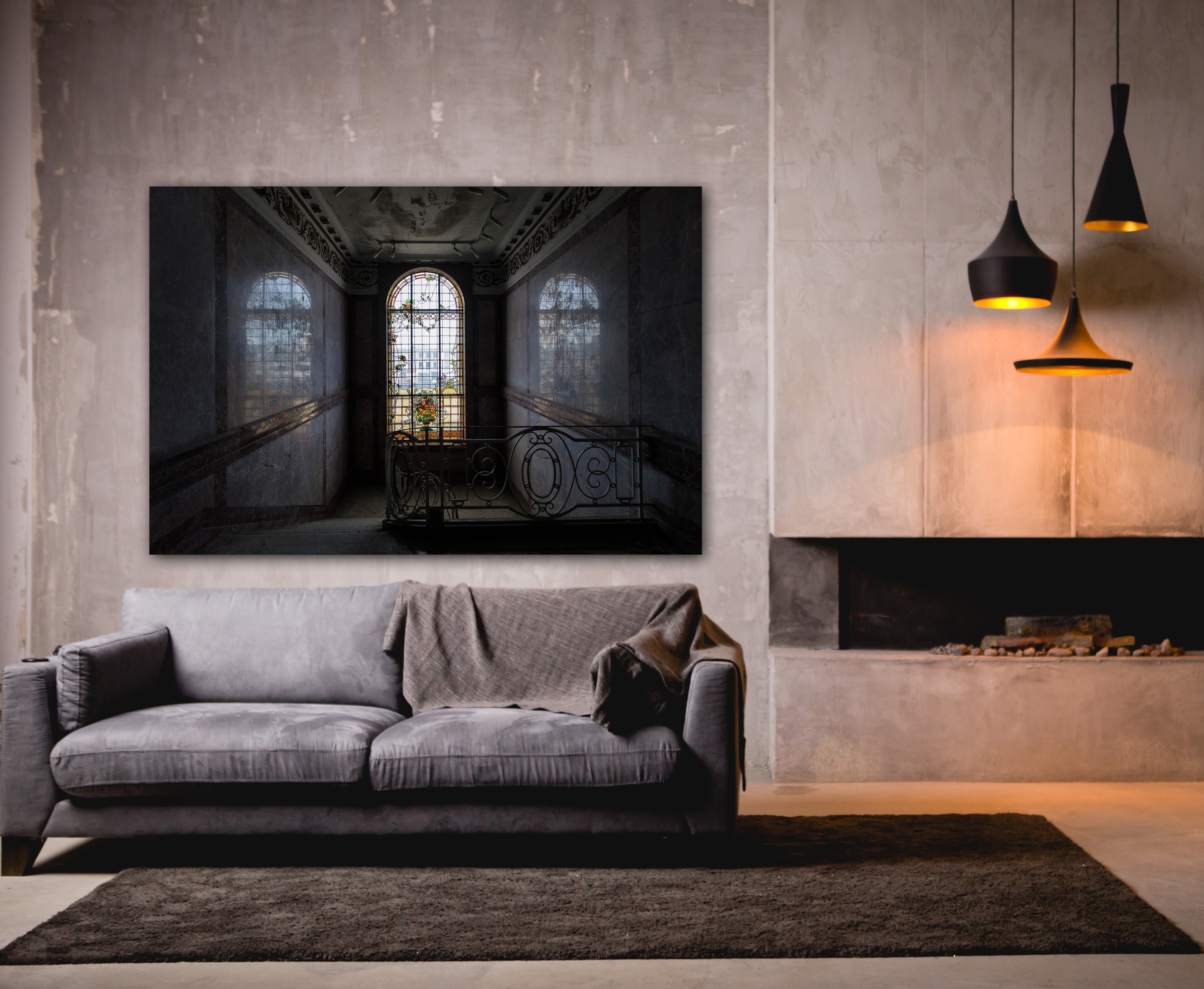 Deze bijzondere afbeelding geeft je een kijkje in een luxueus verlaten pand. Het prachtige glas-in-lood raam die zijn kleurrijk licht schijnt over het trappenhuis zorgt voor een sprookjesachtige kijk in een kleurrijk verleden.