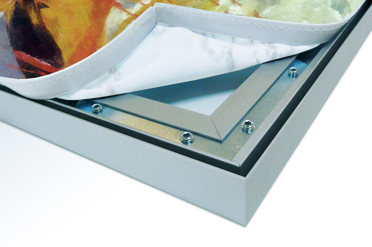 Het aluminium XL Wall Art frame is vanaf de zijde gezien 25 mm hoog, vanaf de voorzijde van de XL Wall Art zie je slechts een aluminium rand van circa 1 mm. De print wordt d.m.v. de sublimatie methode in en op het XL Wall Art doek (220 grams decostof) aangebracht en waarna het doek aan de achterzijde wordt voorzien van een rubber pees. Hierdoor is het werk gemakkelijk in het XL Wall Art frame te plaatsen.