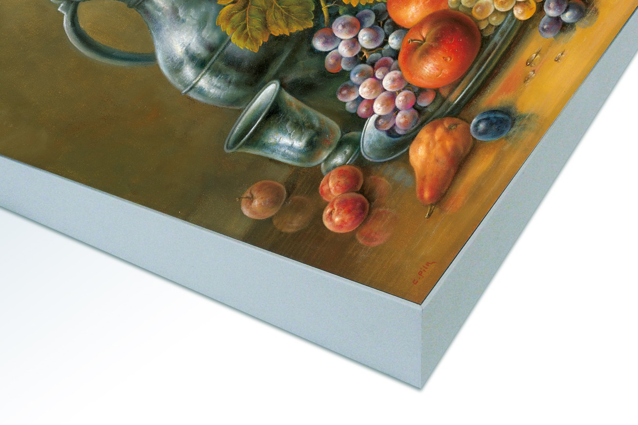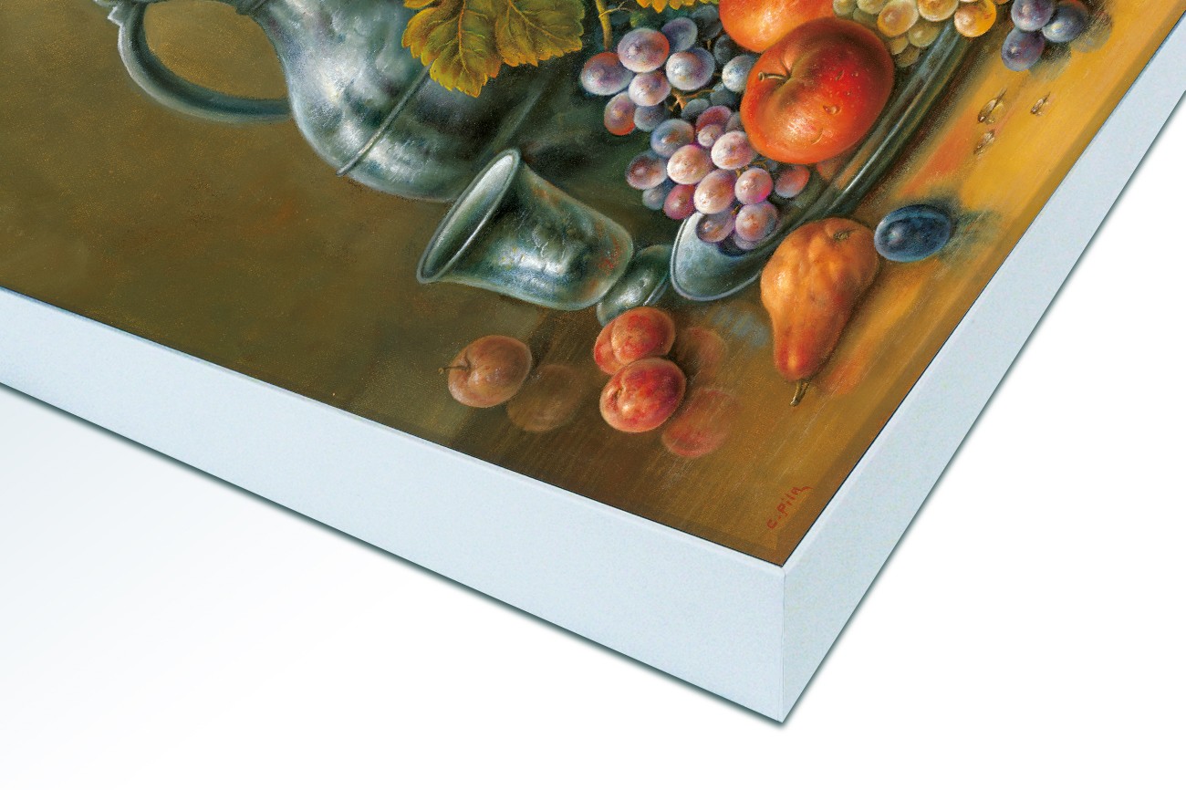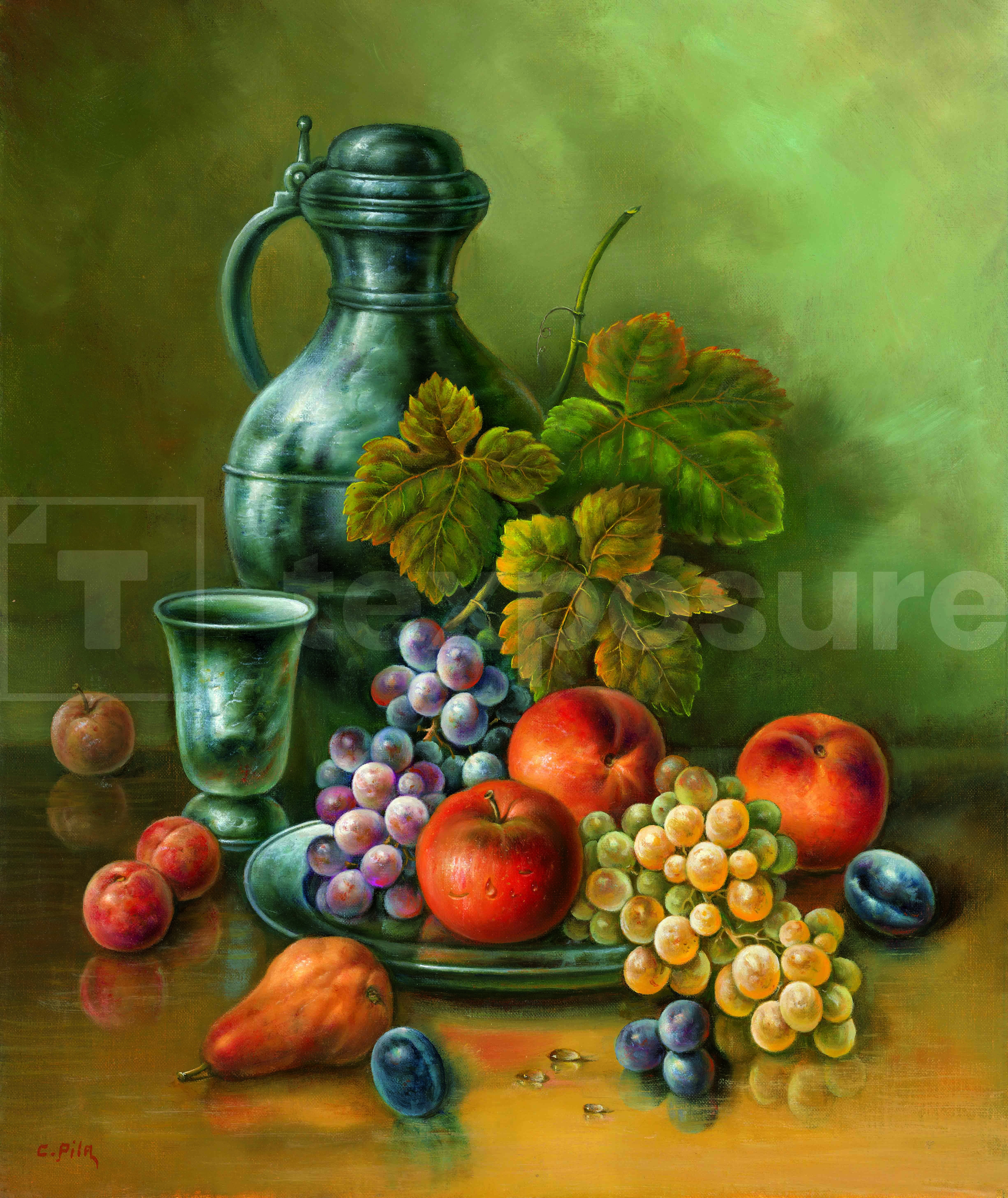 Het stilleven van Pila weergeeft verschillende alle daagse voorwerpen en fruitsoorten. Haar gedetailleerde weergave maakt dat ze de texturen goed weet te weergeven. Door te spelen met het licht laat ze de voorwerpen tot leven komen. Still life with plums is beschikbaar in verschillende formaten, inclusief frame.