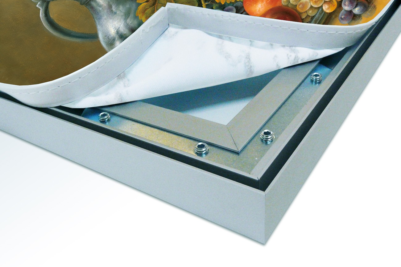 Het aluminium XL Wall Art frame is vanaf de zijde gezien 25 mm hoog, vanaf de voorzijde van de XL Wall Art zie je slechts een aluminium rand van circa 1 mm. De print wordt d.m.v. de sublimatie methode in en op het XL Wall Art doek (220 grams decostof) aangebracht en waarna het doek aan de achterzijde wordt voorzien van een rubber pees. Hierdoor is het werk gemakkelijk in het XL Wall Art frame te plaatsen.