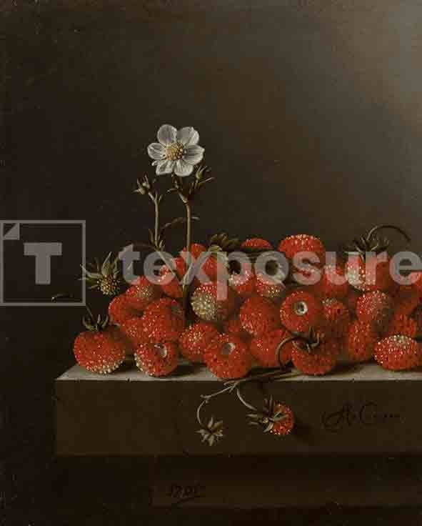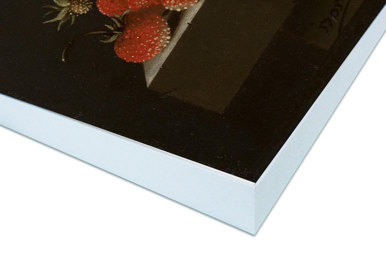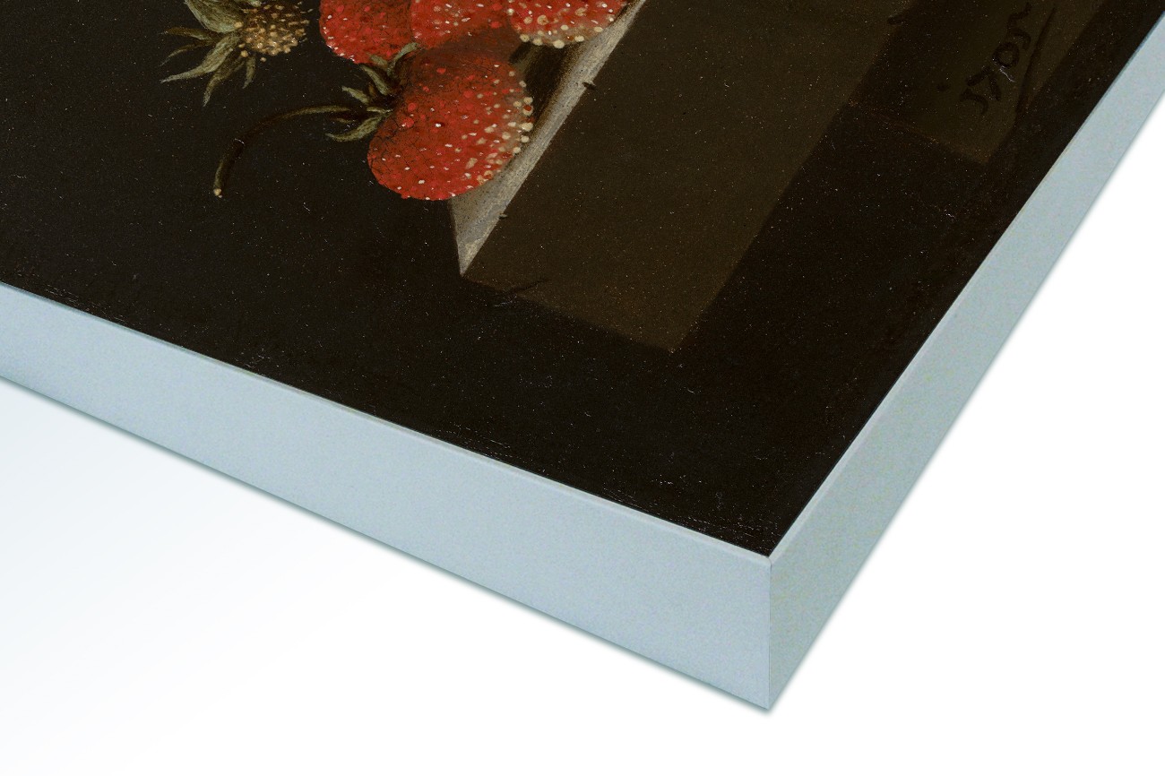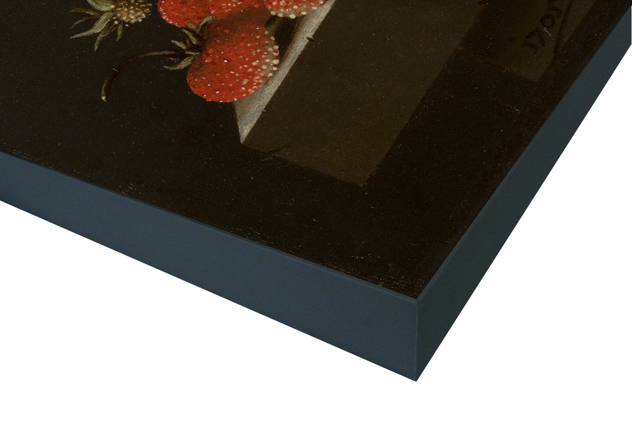 Op een stenen tafelblad liggen wat aardbeien voor een donkere achtergrond. Een takje hangt over de rand, een witte bloem steekt uit de vruchten omhoog. Stipjes witte verf geven de pitjes van de rode aardbeien aan. Een prachtig stilleven dat beschikbaar is in verschillende formaten, inclusief textiel frame.