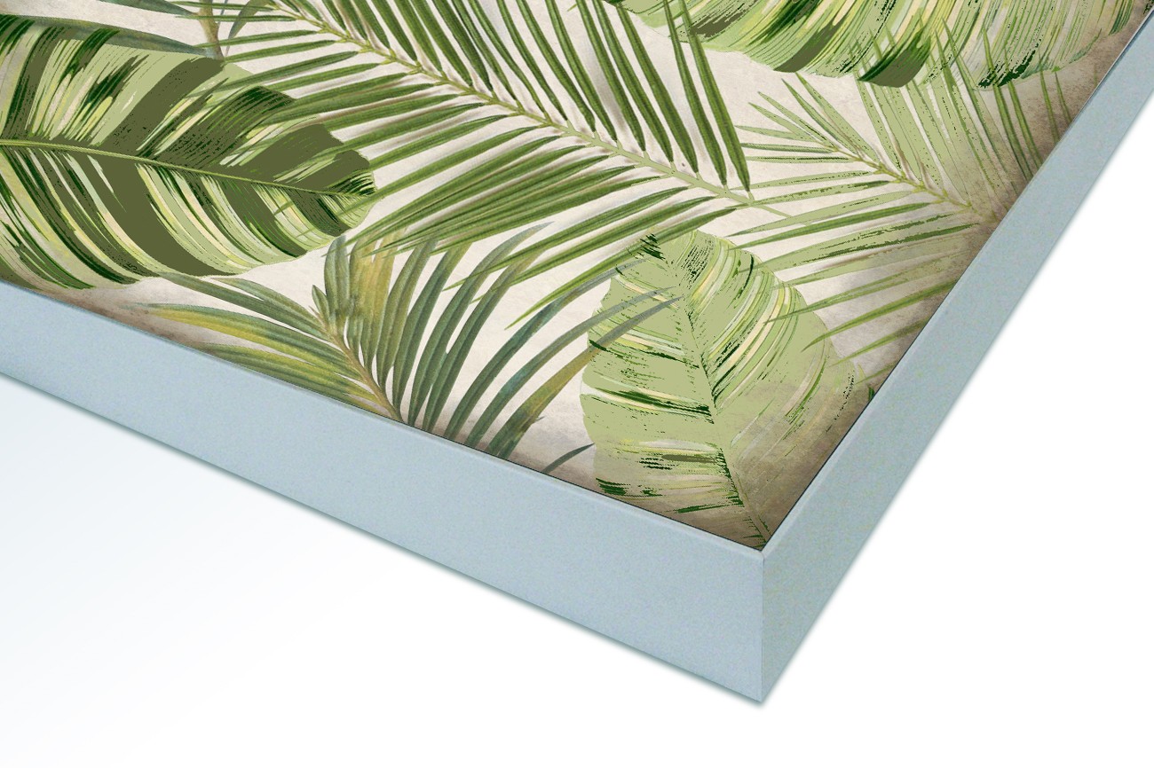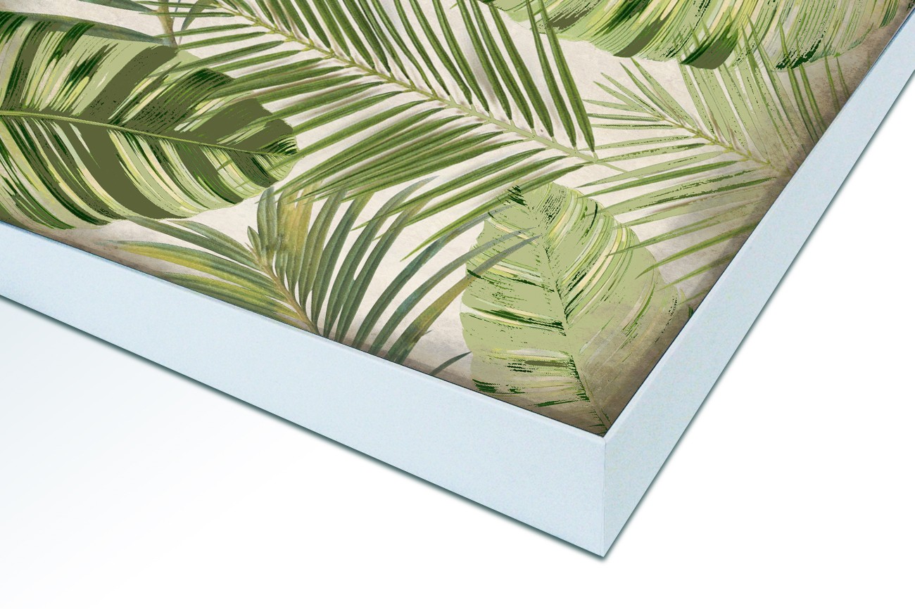 Dit tropische patroon van Kimberly Allen bestaat uit palmboom bladeren. De verschillende groen tinten zorgen voor een fris en levendig beeld waar de details van de bladeren goed zichtbaar zijn. Dit werk is verkrijgbaar in verschillende formaten, inclusief textielframe.