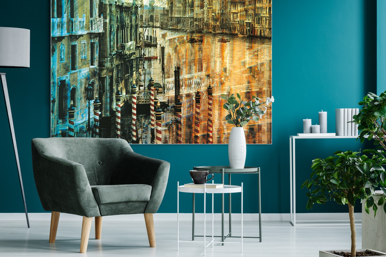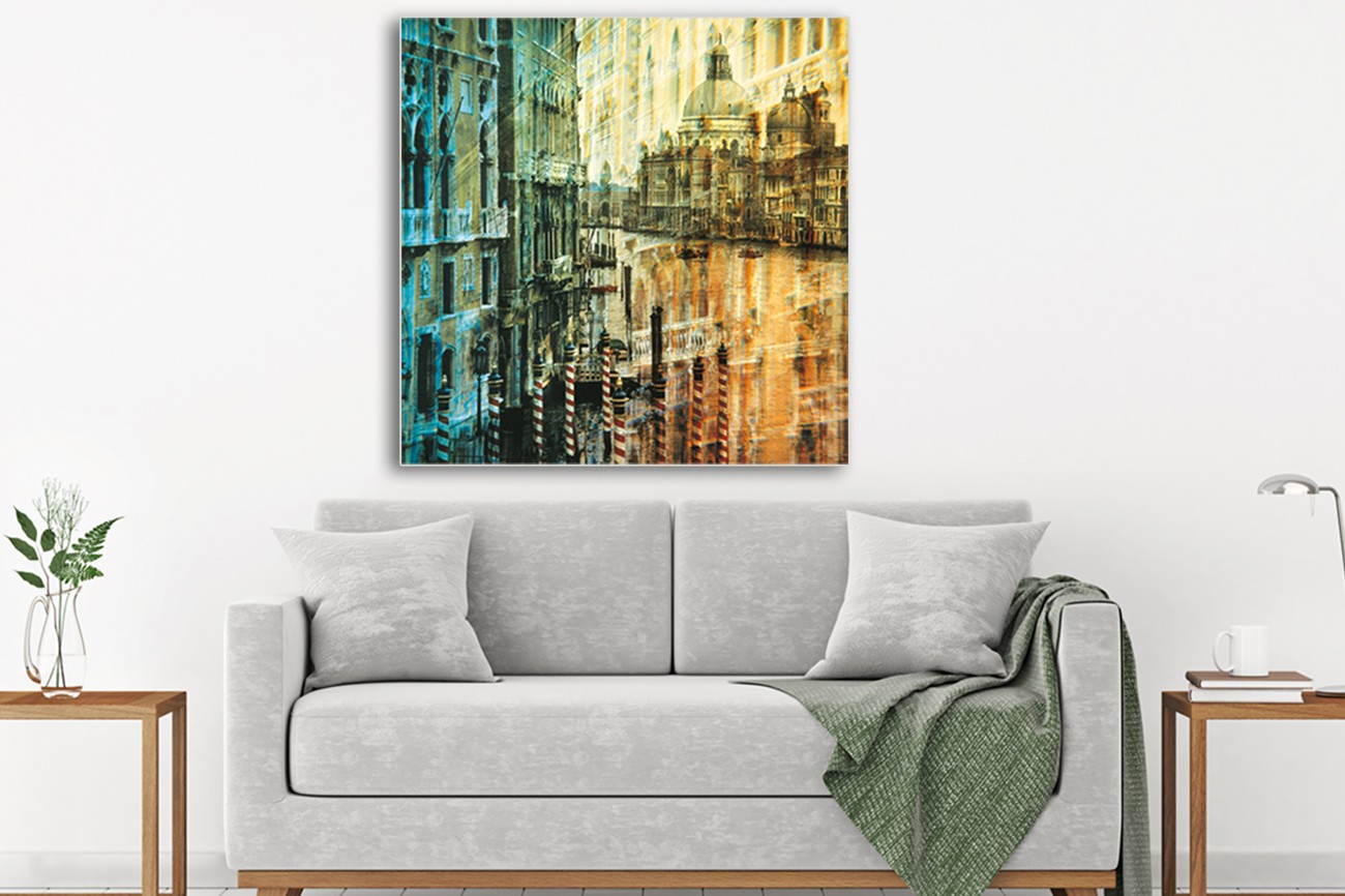Kleurrijk schilderij van een kanaal in Venetië door Gerd Weissing. De gelaagdheid die zichtbaar wordt door weerspiegeling en transparantie geeft het kunstwerk een extra dimensie. Als kijker wordt je meegenomen in de beweging van het water. Venice 1 is verkrijgbaar in verschillende formaten, inclusief textiel frame.