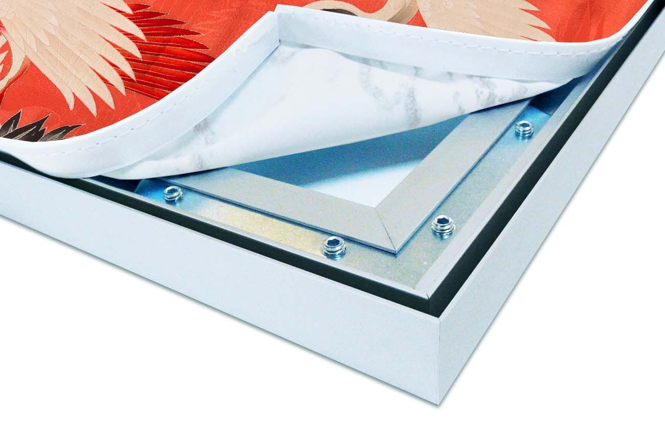 Het aluminium XL Wall Art frame is vanaf de zijde gezien 25 mm hoog, vanaf de voorzijde van de XL Wall Art zie je slechts een aluminium rand van circa 1 mm. De print wordt d.m.v. de sublimatie methode in en op het XL Wall Art doek (220 grams decostof) aangebracht en waarna het doek aan de achterzijde wordt voorzien van een rubber pees. Hierdoor is het werk gemakkelijk in het XL Wall Art frame te plaatsen.